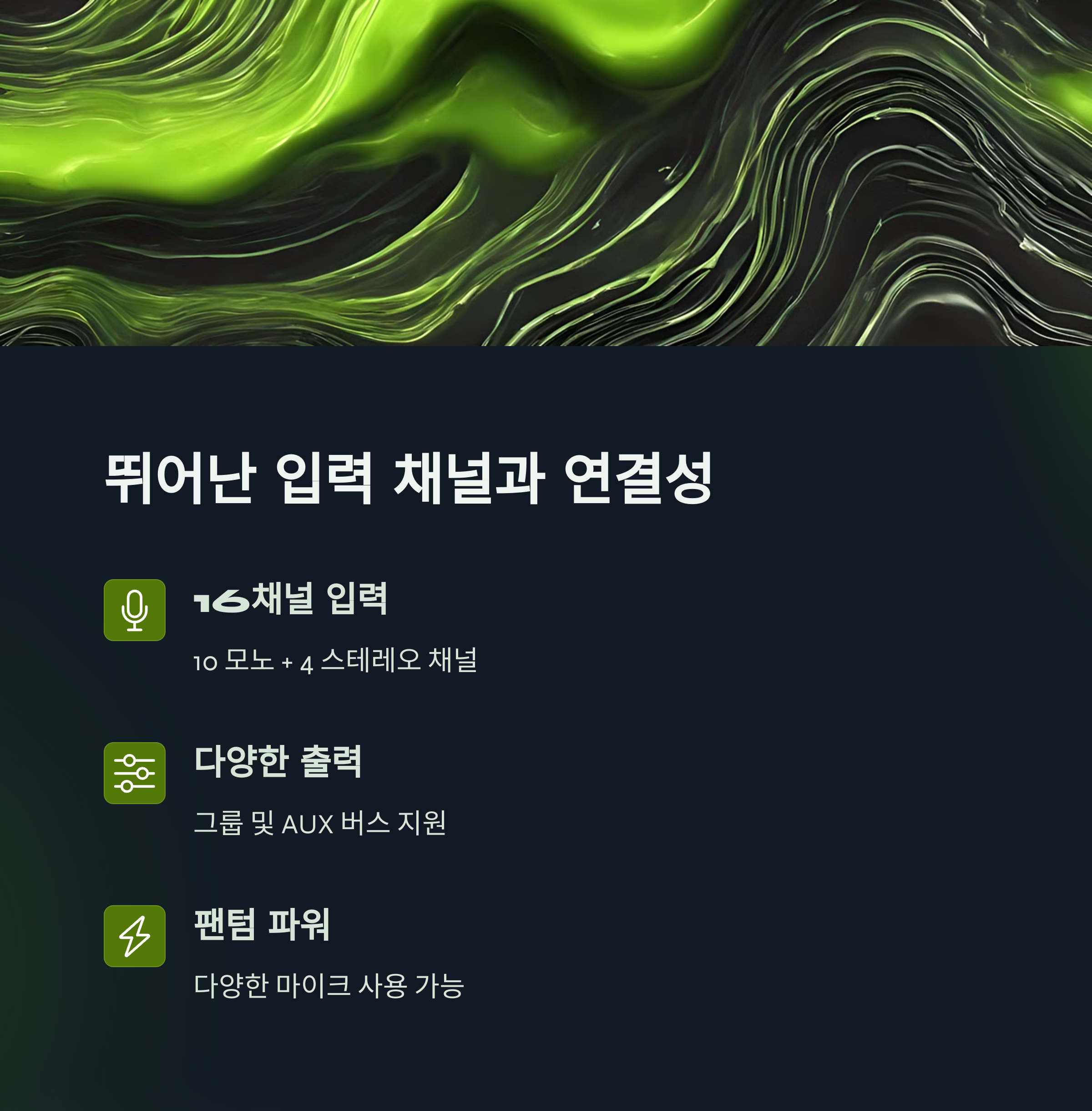 - 입력 채널: 16채널 (10 마이크/라인 입력 + 4 스테레오 입력)