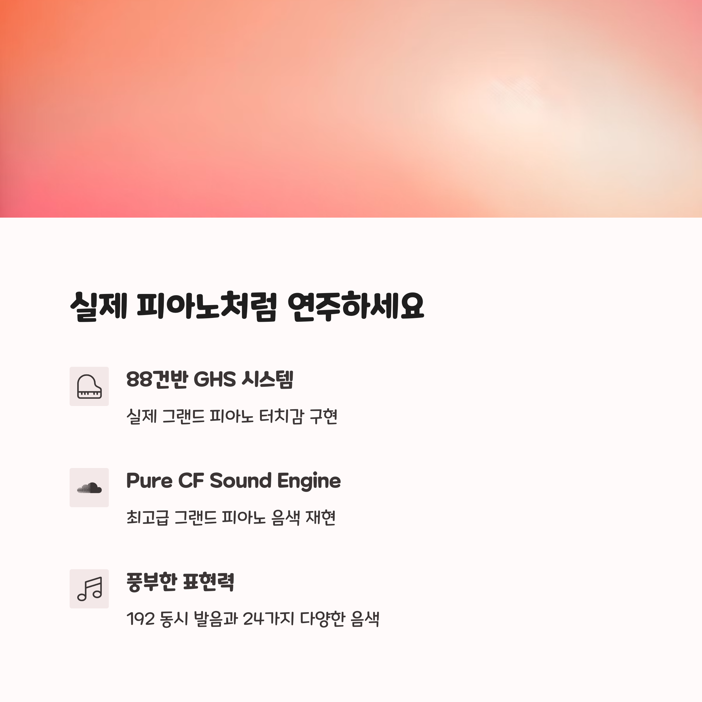 Pure CF Sound Engine과 GHS 건반 시스템은 어쿠스틱 피아노와 유사한 연주 경험을 제공합니다. - 다양한 기능 지원