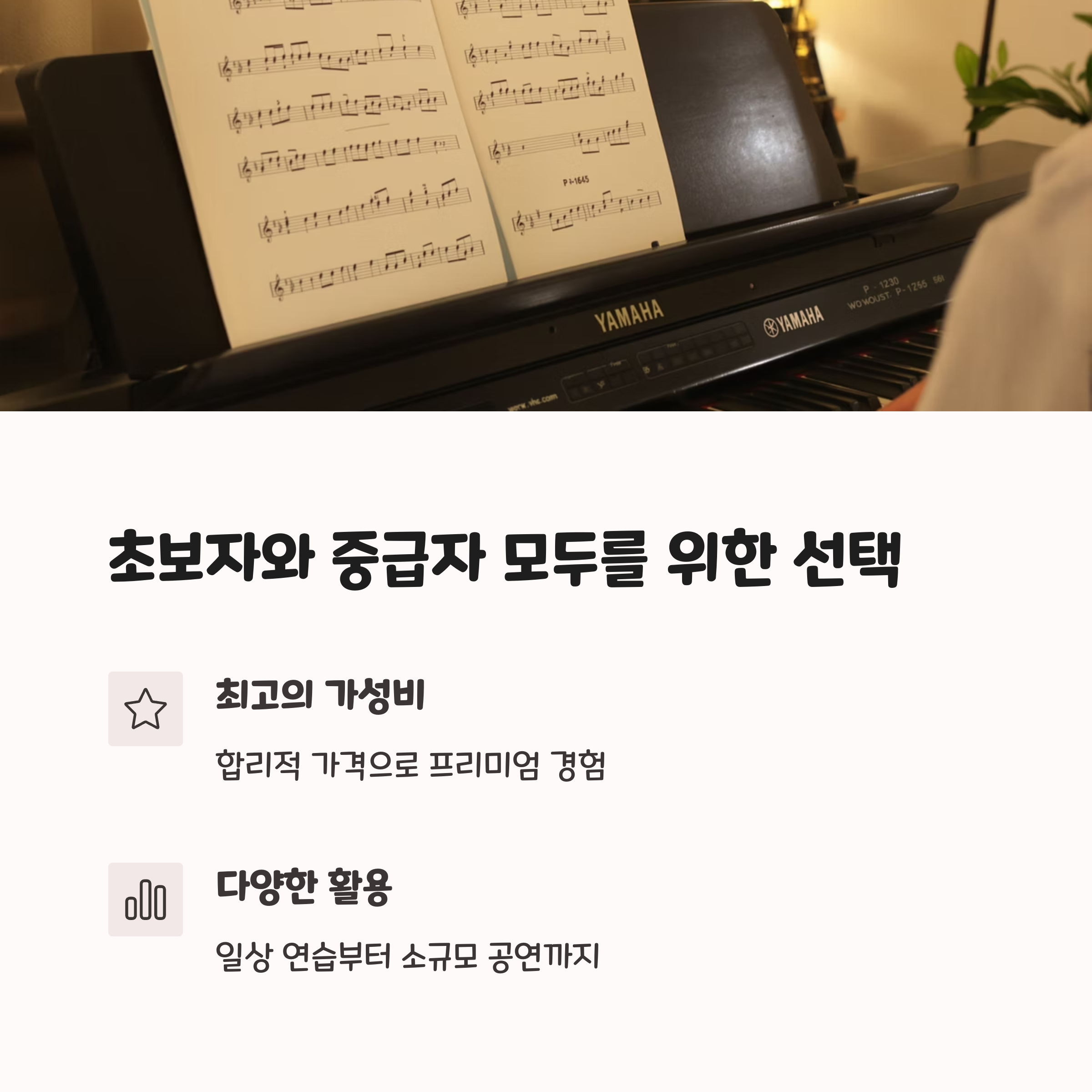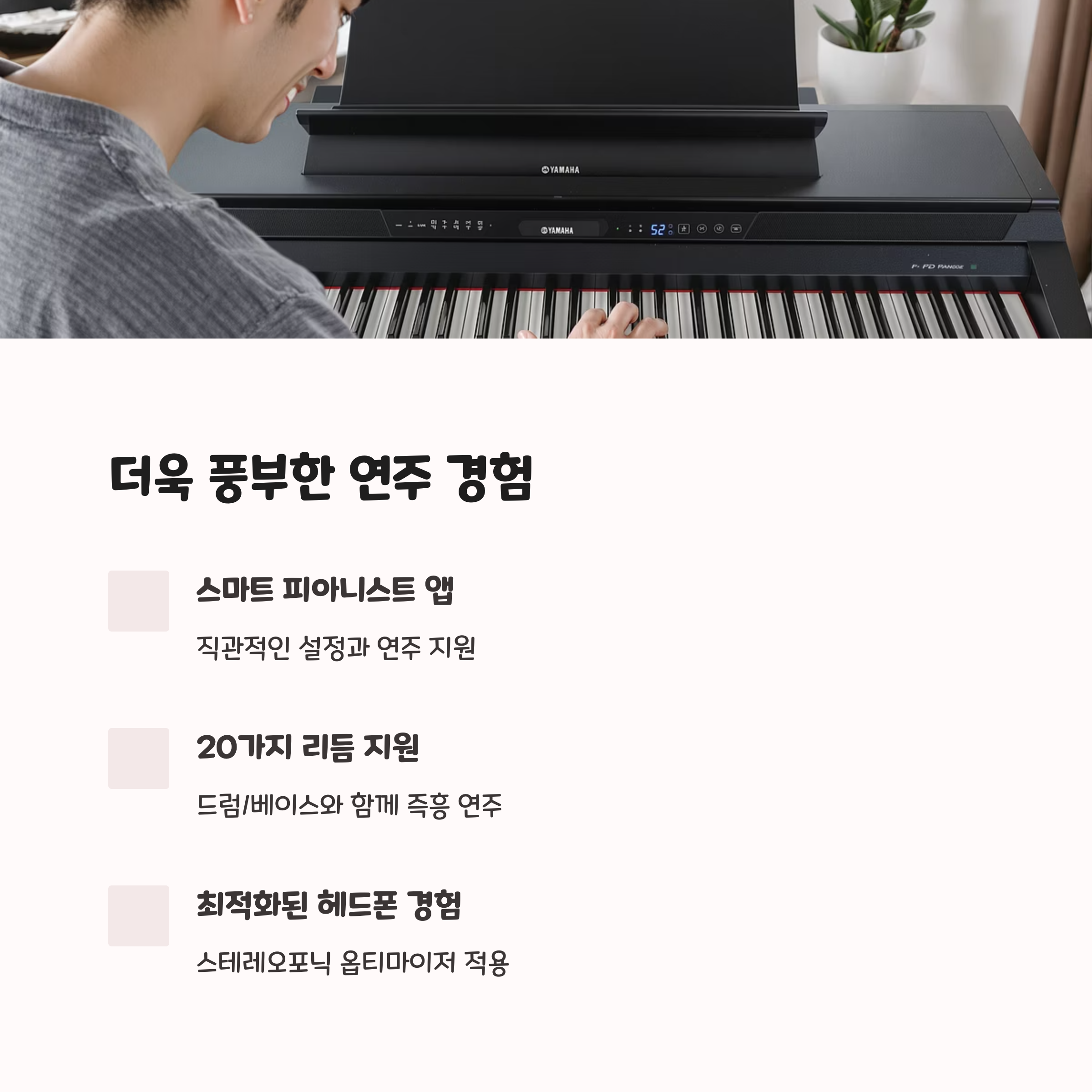 리듬 패턴과 스마트 피아니스트 앱 연동 기능은 초보자와 중급자 모두에게 유용합니다. - 합리적인 가격대