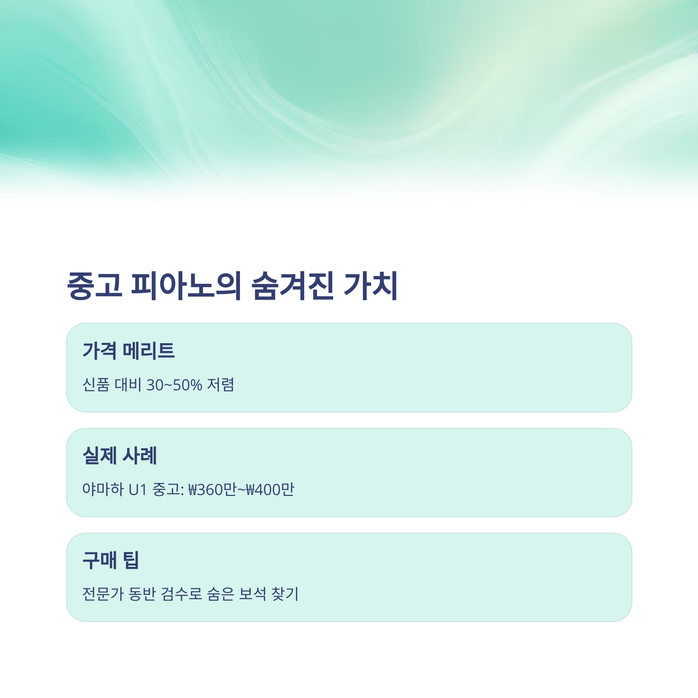 중고 업라이트 피아노는 상태와 연식에 따라 가격 차이가 큽니다. 일반적으로 신품 대비 약 30~50% 저렴하게 구매할 수 있습니다.