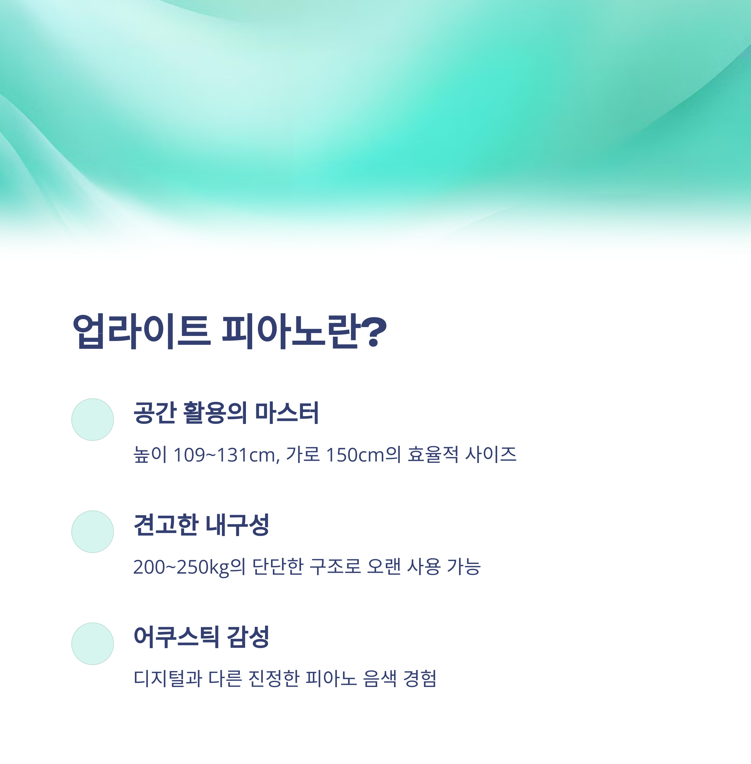 - 사이즈 확인: 업라이트 피아노 사이즈는 설치 공간과 사용 목적에 따라 선택해야 합니다.
