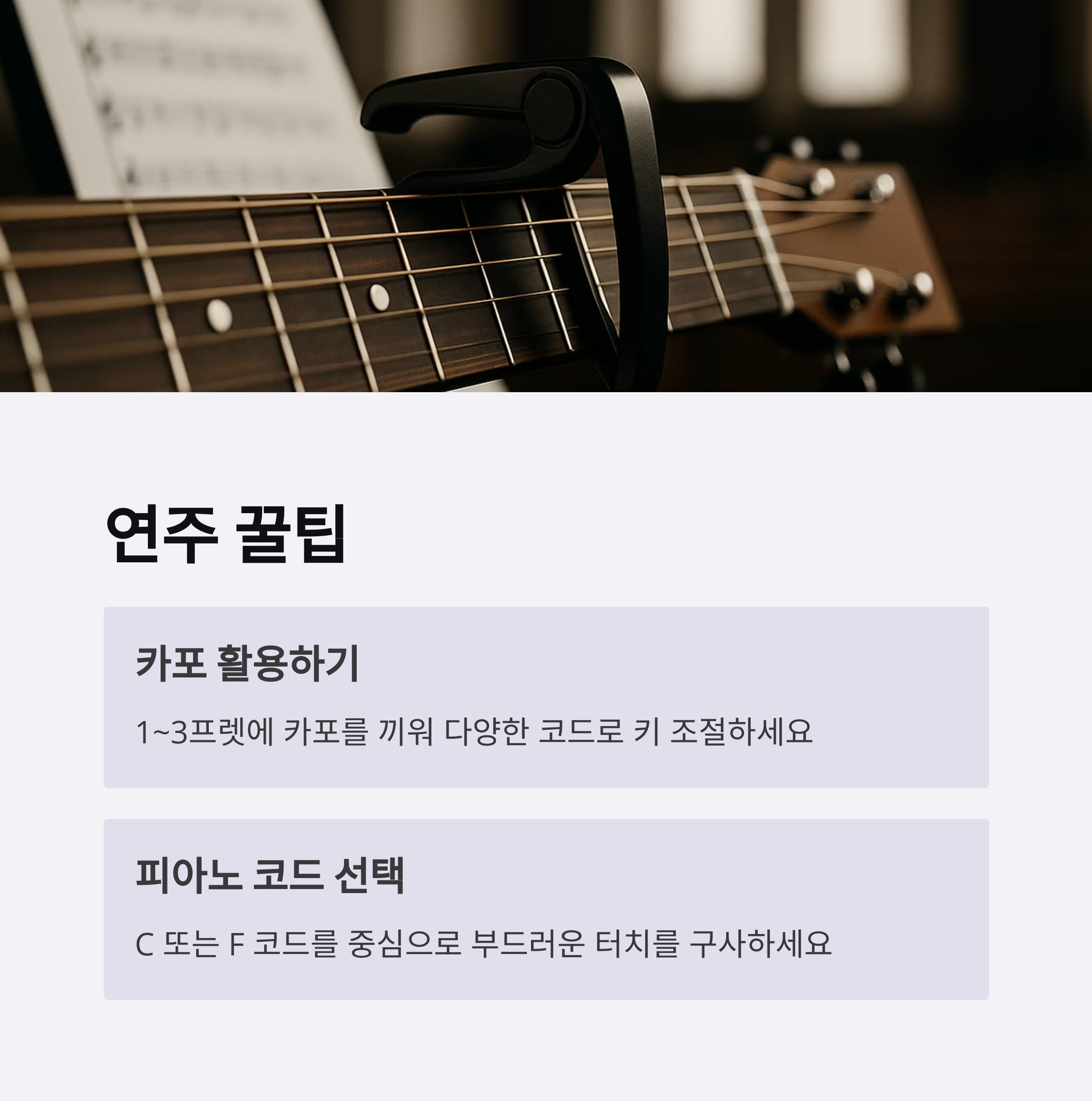 기타 연주 시 여성 보컬에게 맞게 1~3프렛에 카포를 끼우면 다양한 코드로 키를 조절할 수 있습니다. - 피아노는 C 또는 F 코드 선호