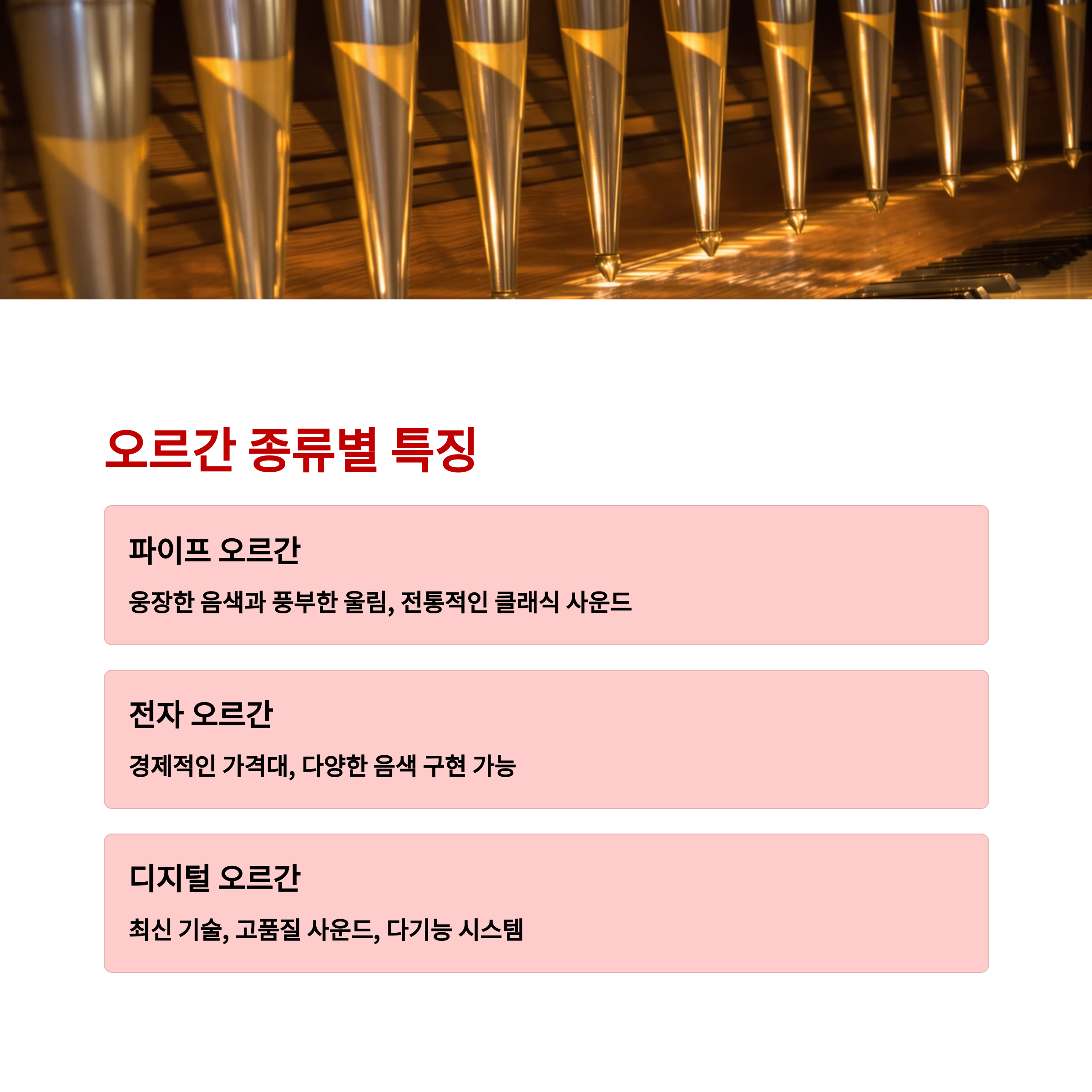 - 구조: 2~5개 이상의 손건반, 발건반, 수백~수천 개의 파이프, 복잡한 송풍기와 바람 상자 구조를 가집니다.
