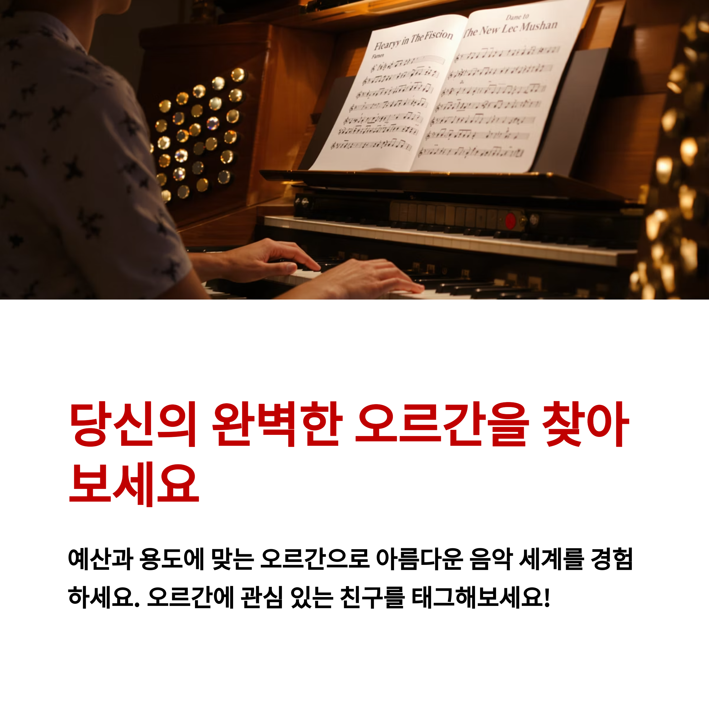 오르간은 그 종류와 가격대가 매우 다양합니다. 파이프 오르간부터 전자 오르간, 디지털 오르간, 소형 오르간까지 용도와 예산에 맞는 선택이 중요합니다. 오르간의 깊은 매력과 실제 시세를 꼼꼼히 비교해보시고, 나에게 맞는 오르간을 찾아보세요. 오르간에 대해 궁금한 점이 있다면 언제든 댓글로 남겨주세요!