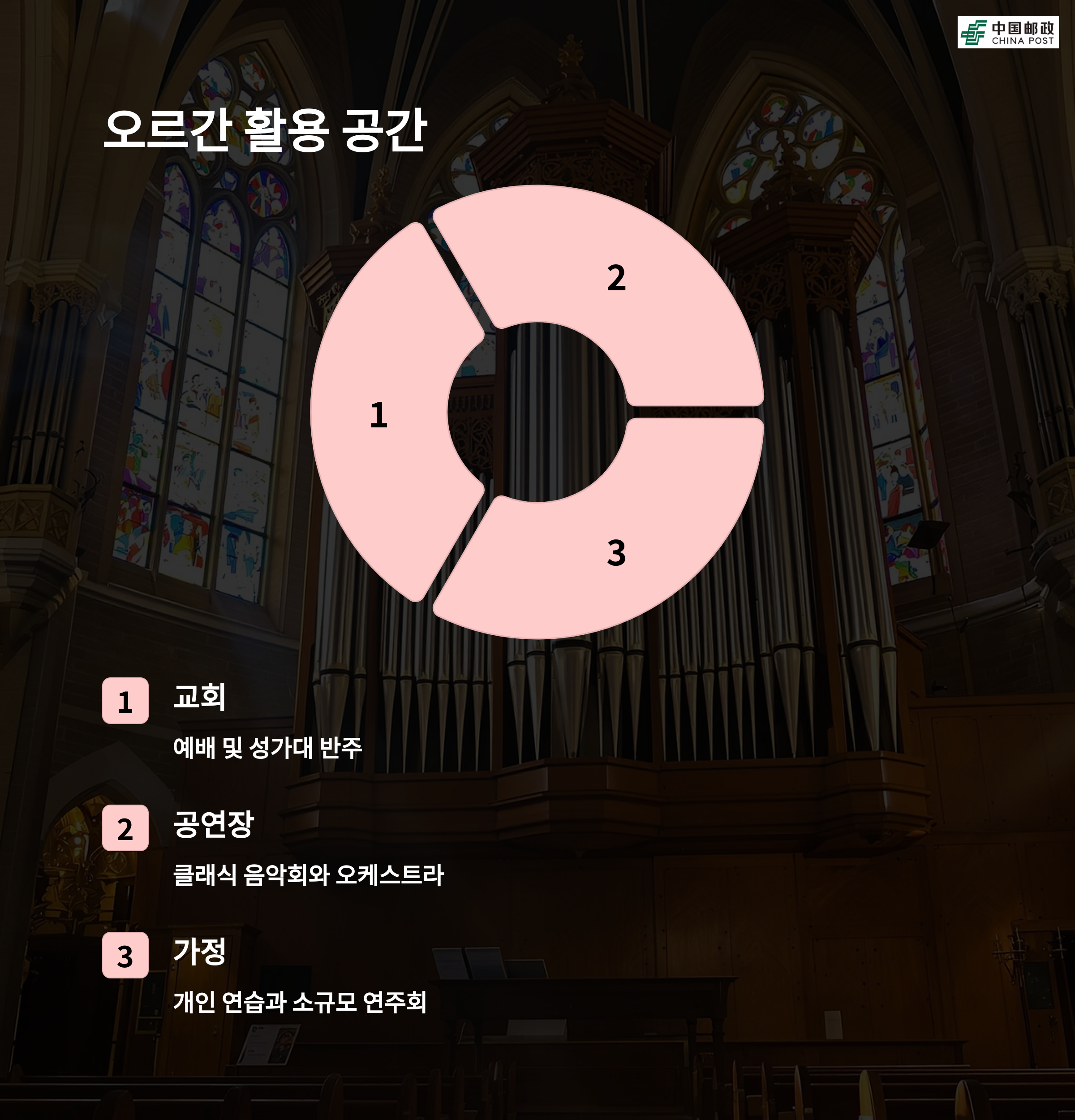 - 특징: 실제 파이프를 통해 공기를 불어넣어 소리를 내는 전통적인 오르간입니다. 교회나 콘서트홀 등 대형 공간에 설치됩니다.
