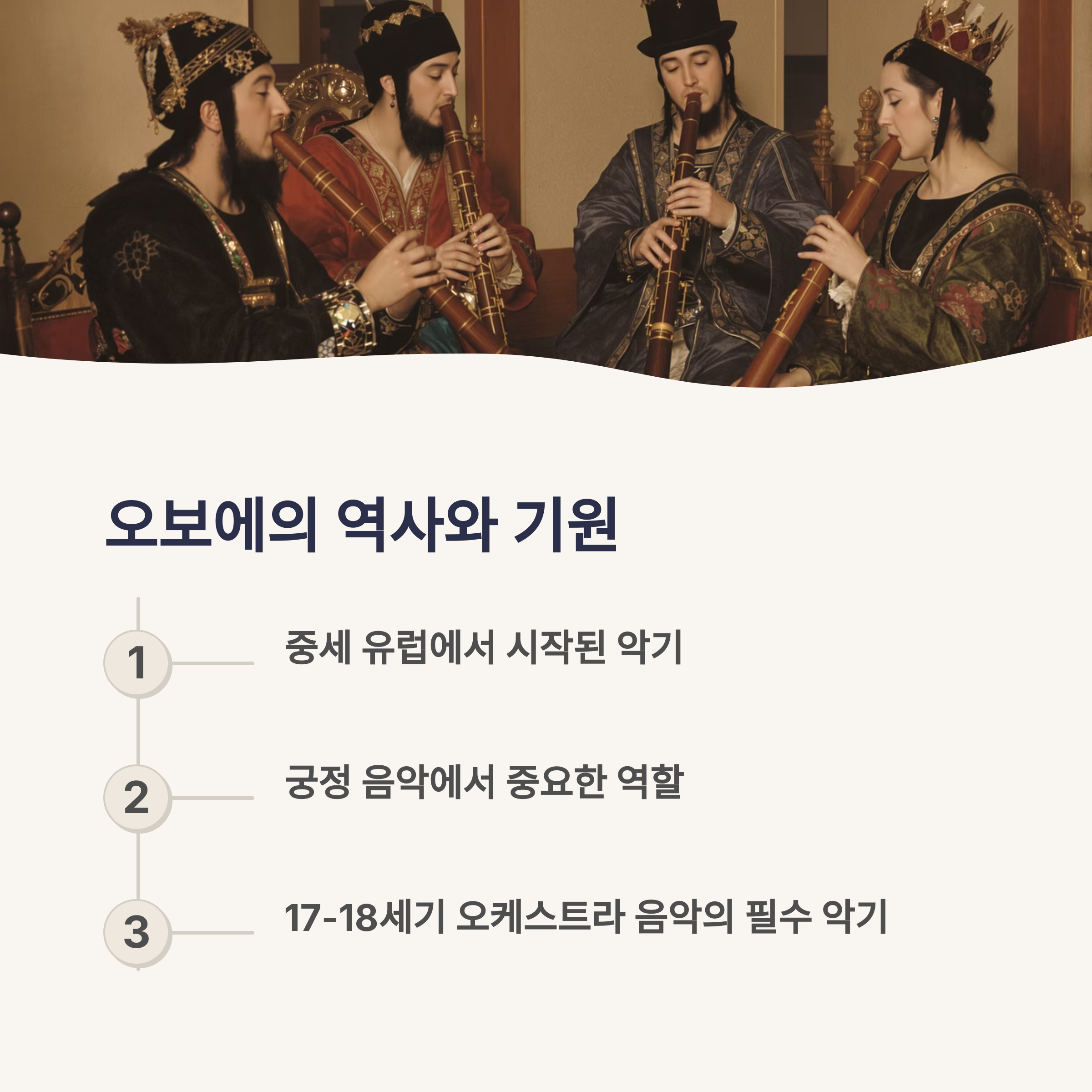 음색 특징 오보에는 따뜻하고 풍부한 소리로 다양한 음악적 표현을 가능하게 합니다.