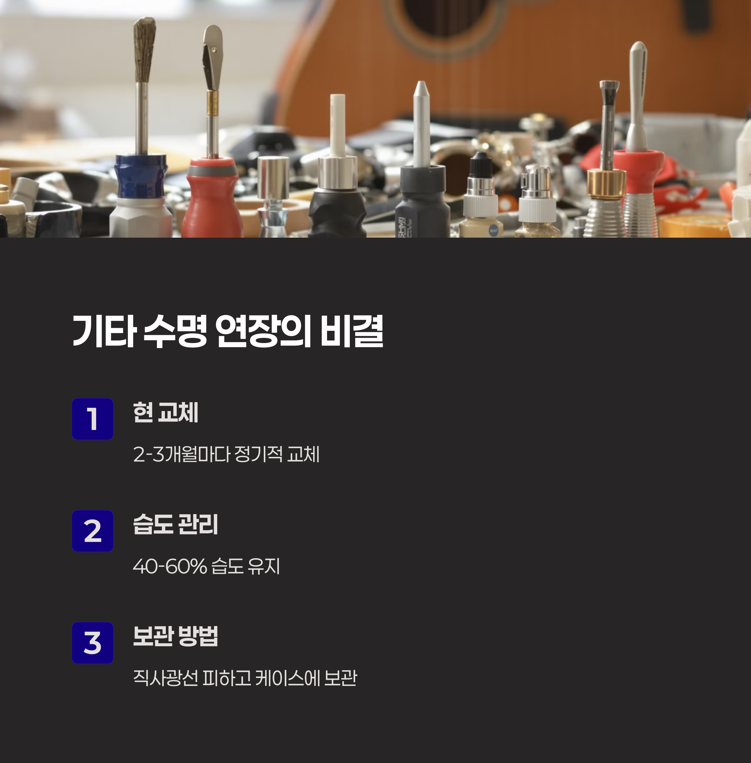 | 사운드와 연주 스타일에 따라 선택 가능 | 브랜드별 시그니처 사운드 차이 존재 | 초보자일수록 관리법 익히는 것 중요 |