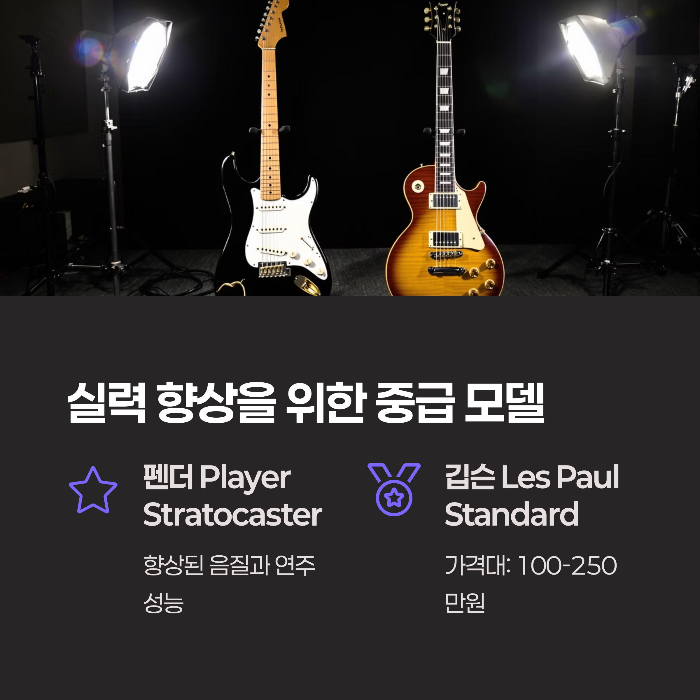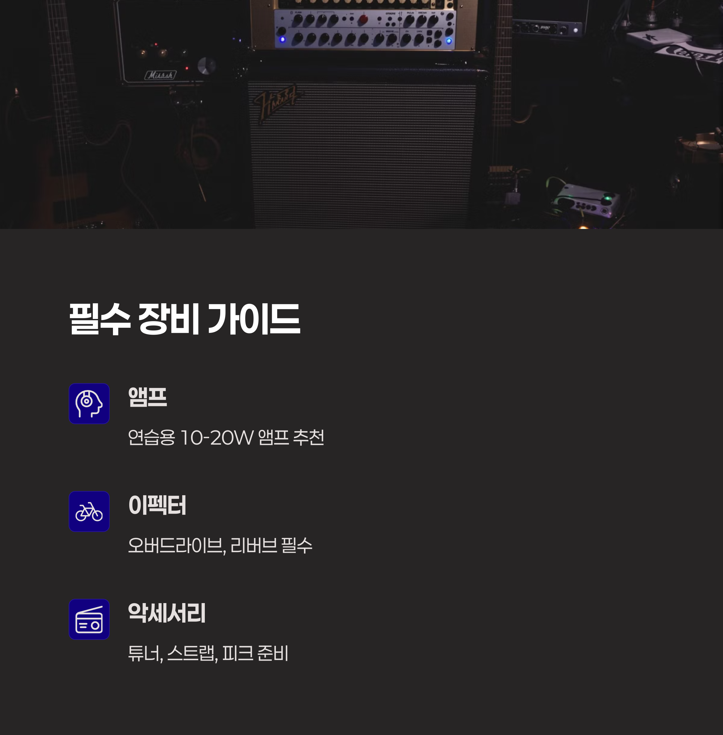 | 추천 브랜드 | 입문자는 야마하, 스콰이어. 중상급자는 펜더, 깁슨. |