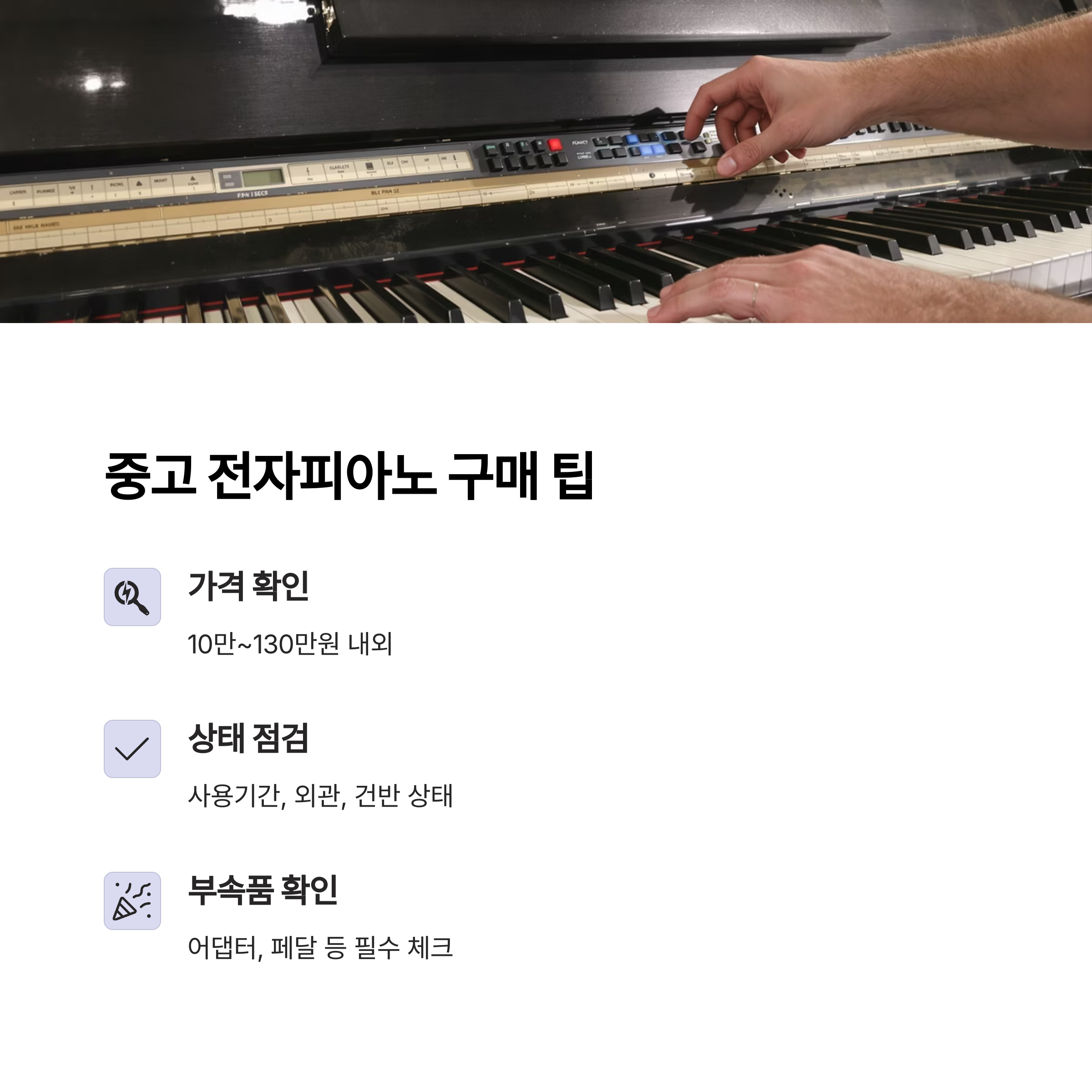 • 중고 구매 시 확인사항: 외관, 건반 상태, 페달 작동, 부속품 포함 여부