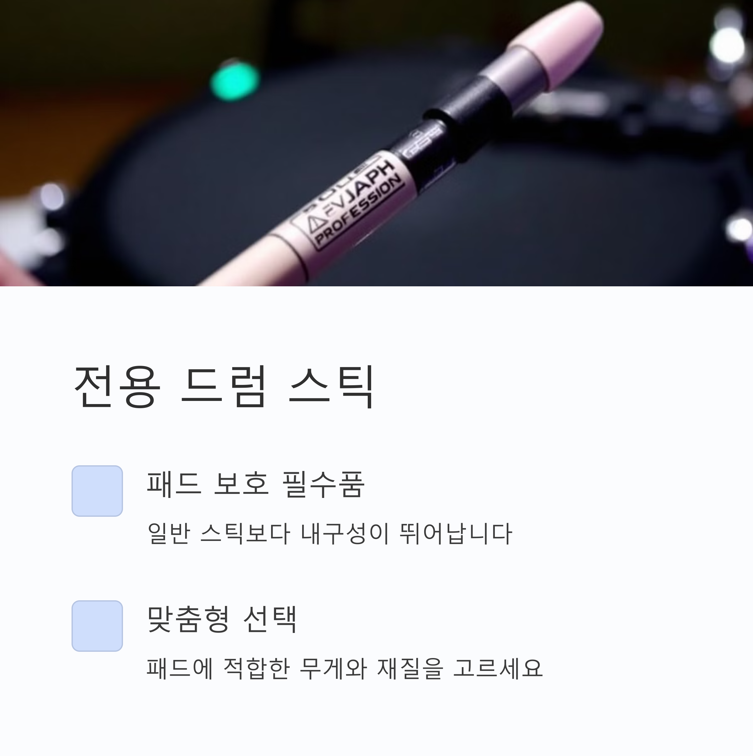 | 드럼 스틱 선택 | 전자 드럼 전용 스틱을 사용하는 것이 좋습니다. |