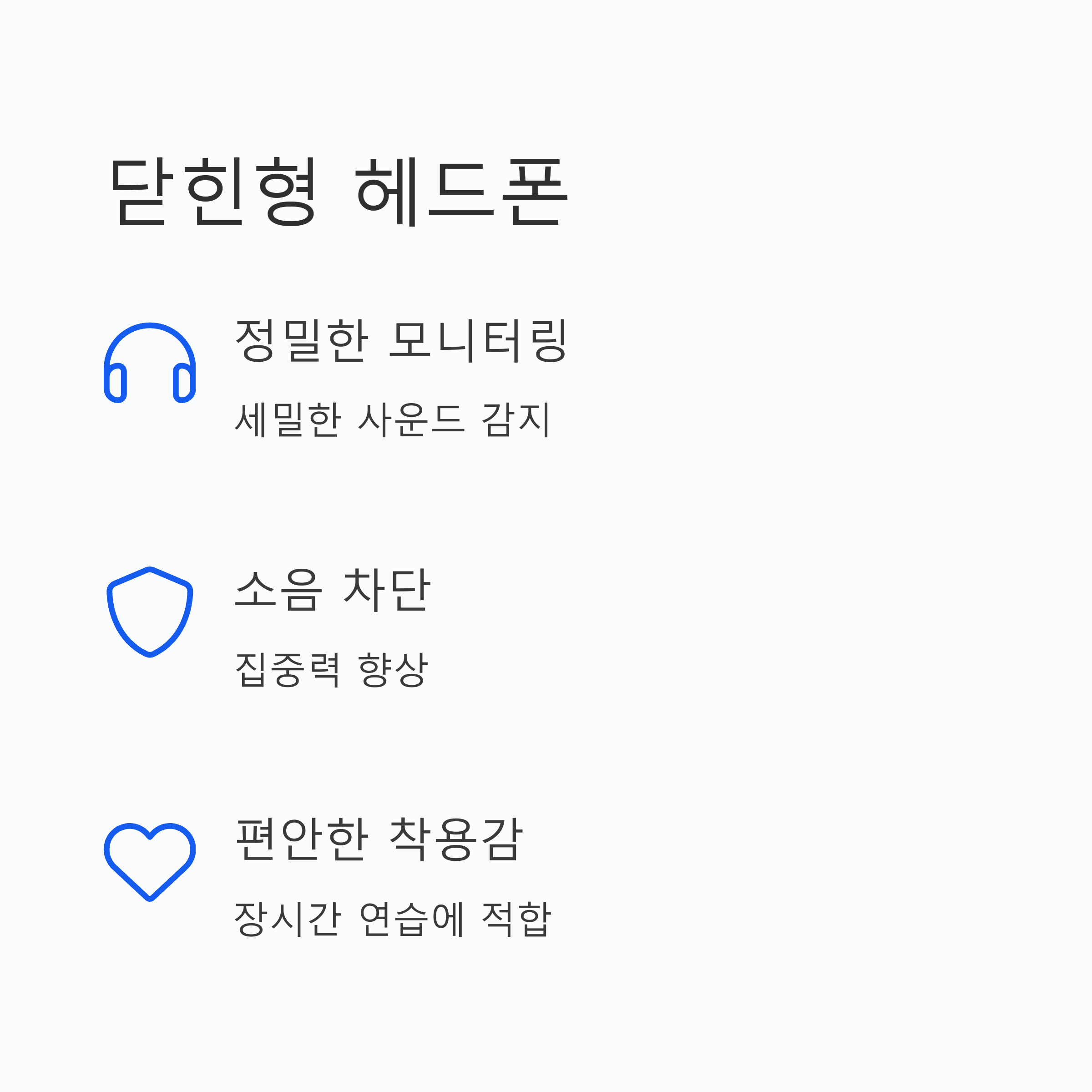 | 헤드폰 활용 | 정확한 모니터링을 위해 닫힌형 헤드폰이 추천됩니다. |