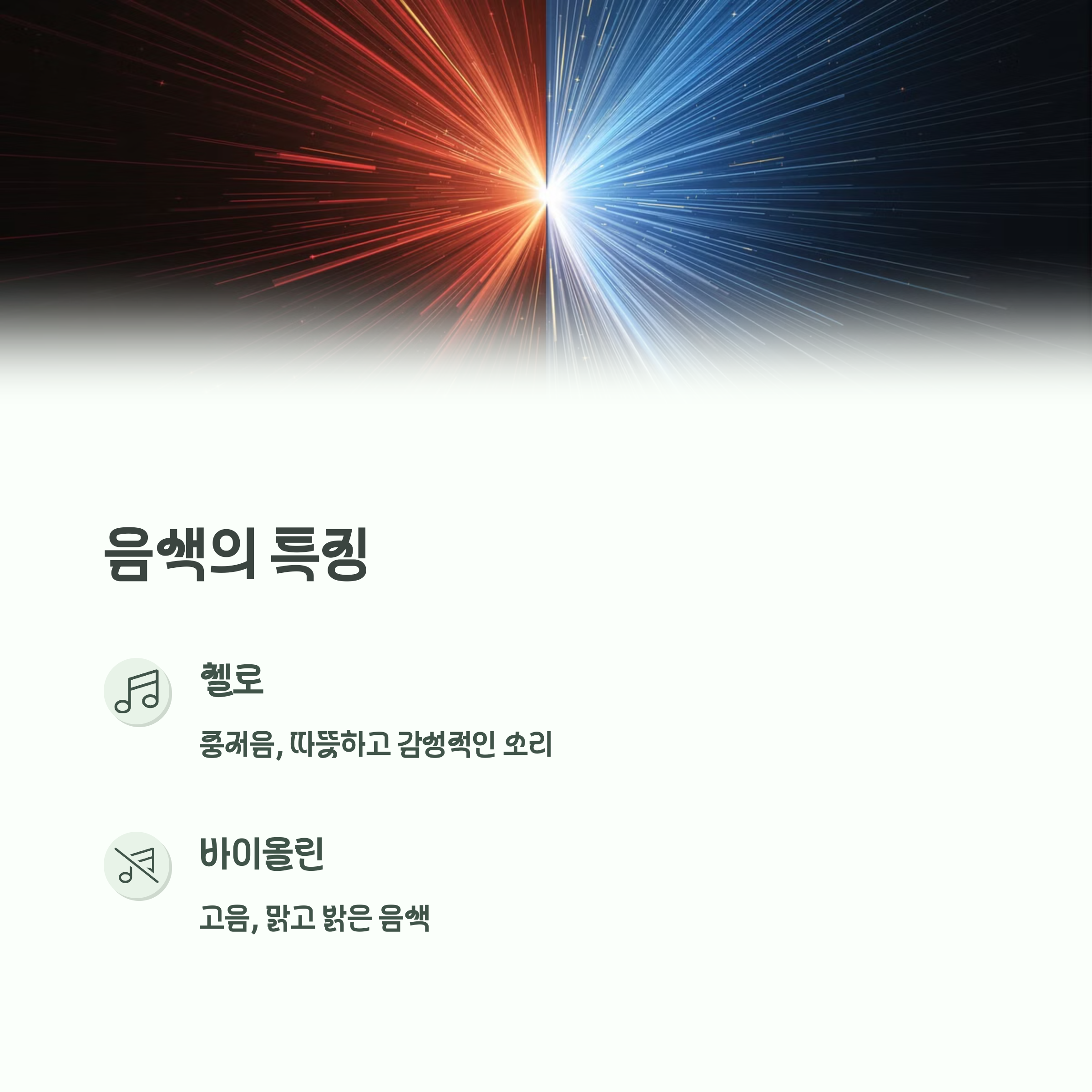 | 크고 깊은 울림을 위해 내부 공명 구조가 큽니다. | 고음이 강조된 밝고 맑은 음색을 가집니다. | 바이올린이 첼로보다 입문 난이도는 낮은 편입니다. |