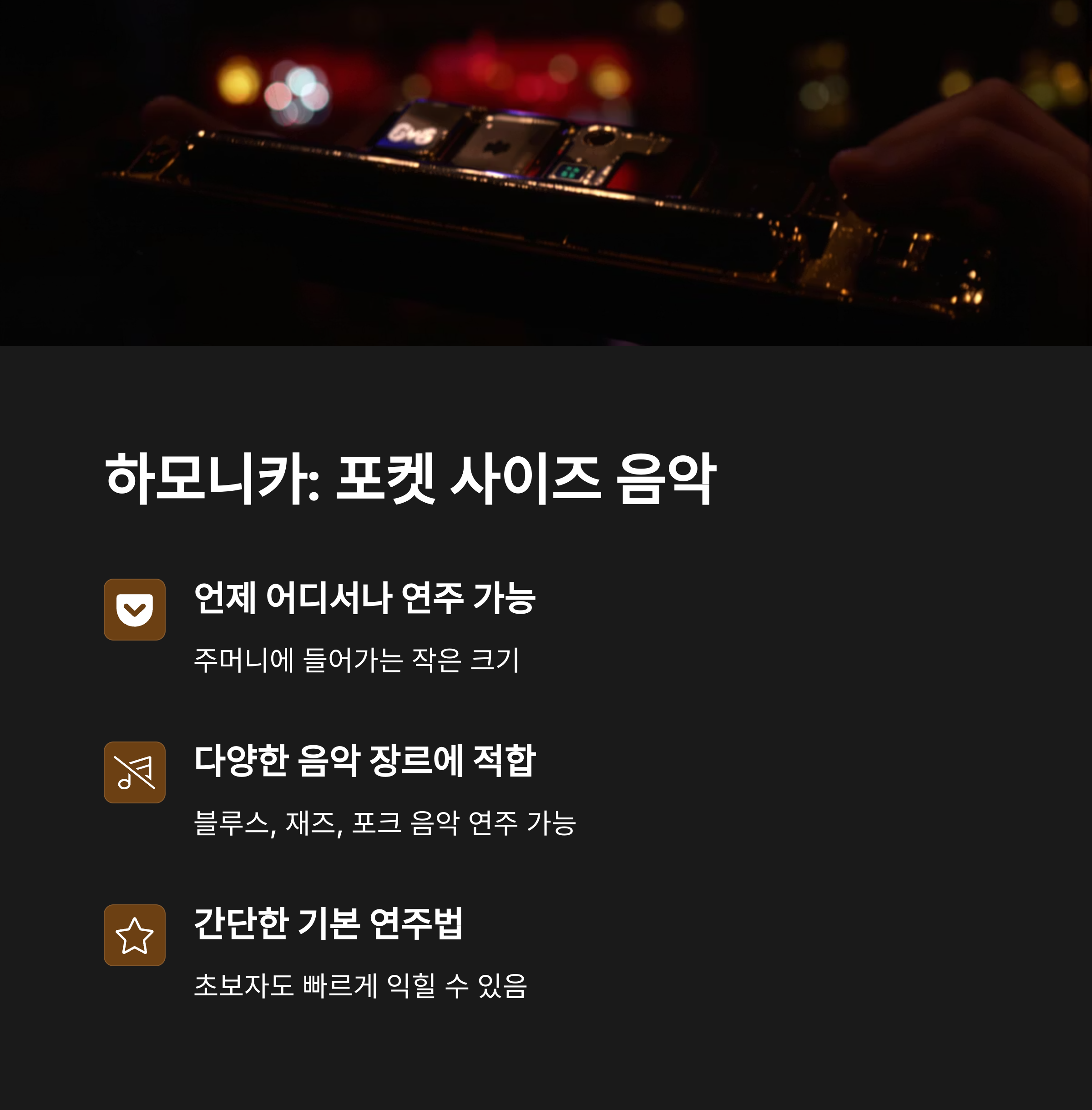 | 하모니카 | 작은 크기로 어디서나 연주할 수 있으며, 기본 연주법이 간단합니다. |