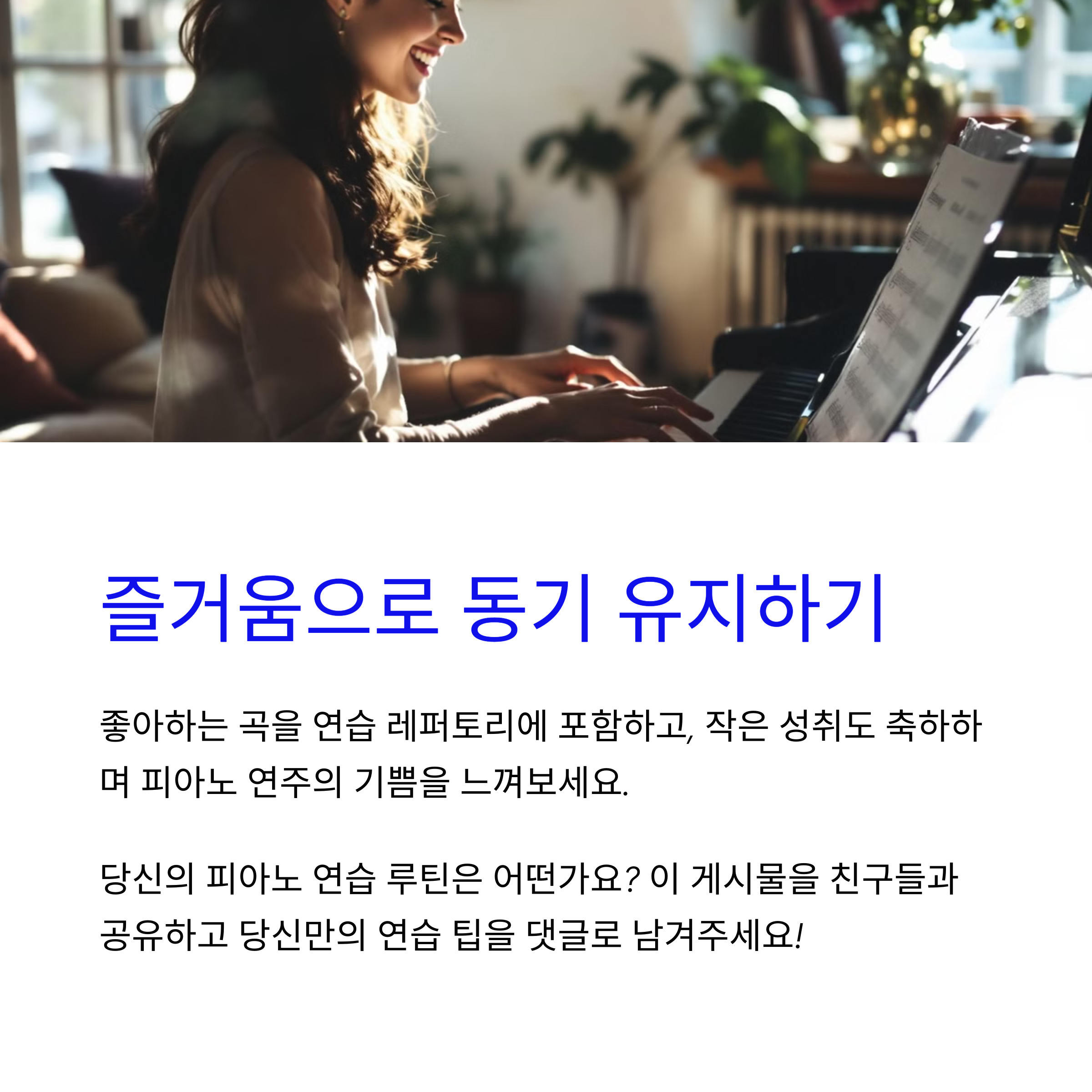 피아노 독학 중 어려움을 겪었던 경험이나, 효과적이었던 연습 방법이 있다면 댓글로 공유해주세요. 많은 분들과 소중한 노하우를 나눌 수 있는 공간이 되었으면 합니다.