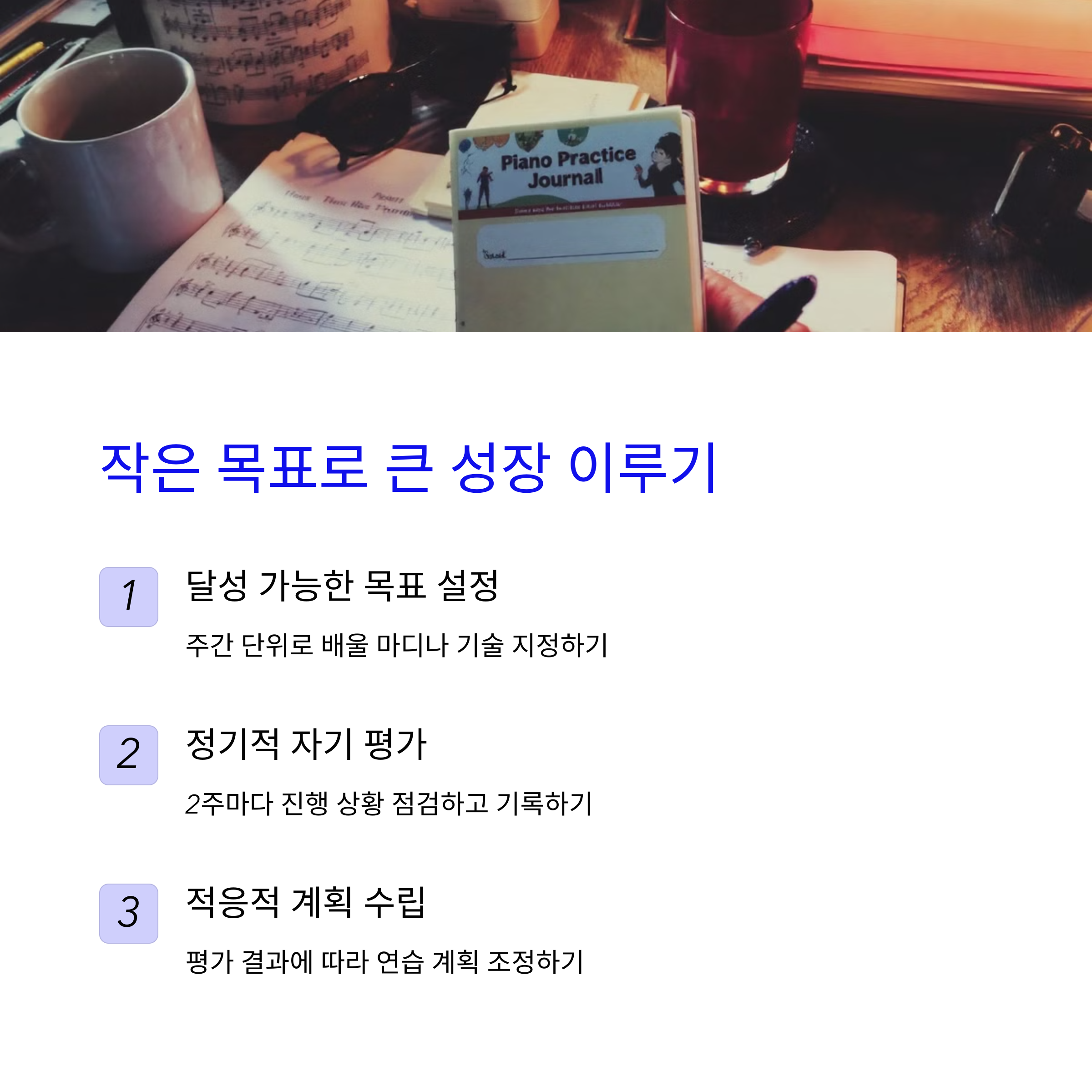 독학을 성공적으로 이어가기 위해서는 작은 목표를 세우고 성취감을 얻는 루틴이 중요합니다. 하루하루 피아노와 친해진다는 마음으로 즐기면서 연습해야 꾸준히 유지할 수 있습니다. 자신의 연주를 녹음해서 들어보거나, 주 1회 스스로 리포트를 작성해보는 것도 좋은 방법입니다. 또한 온라인 커뮤니티에서 소통하거나, 유튜브 강의를 참고하는 것도 스스로를 점검하는 데 도움이 됩니다. 작은 실수 하나라도 꾸준히 고쳐나가는 과정이 진짜 실력으로 이어집니다.