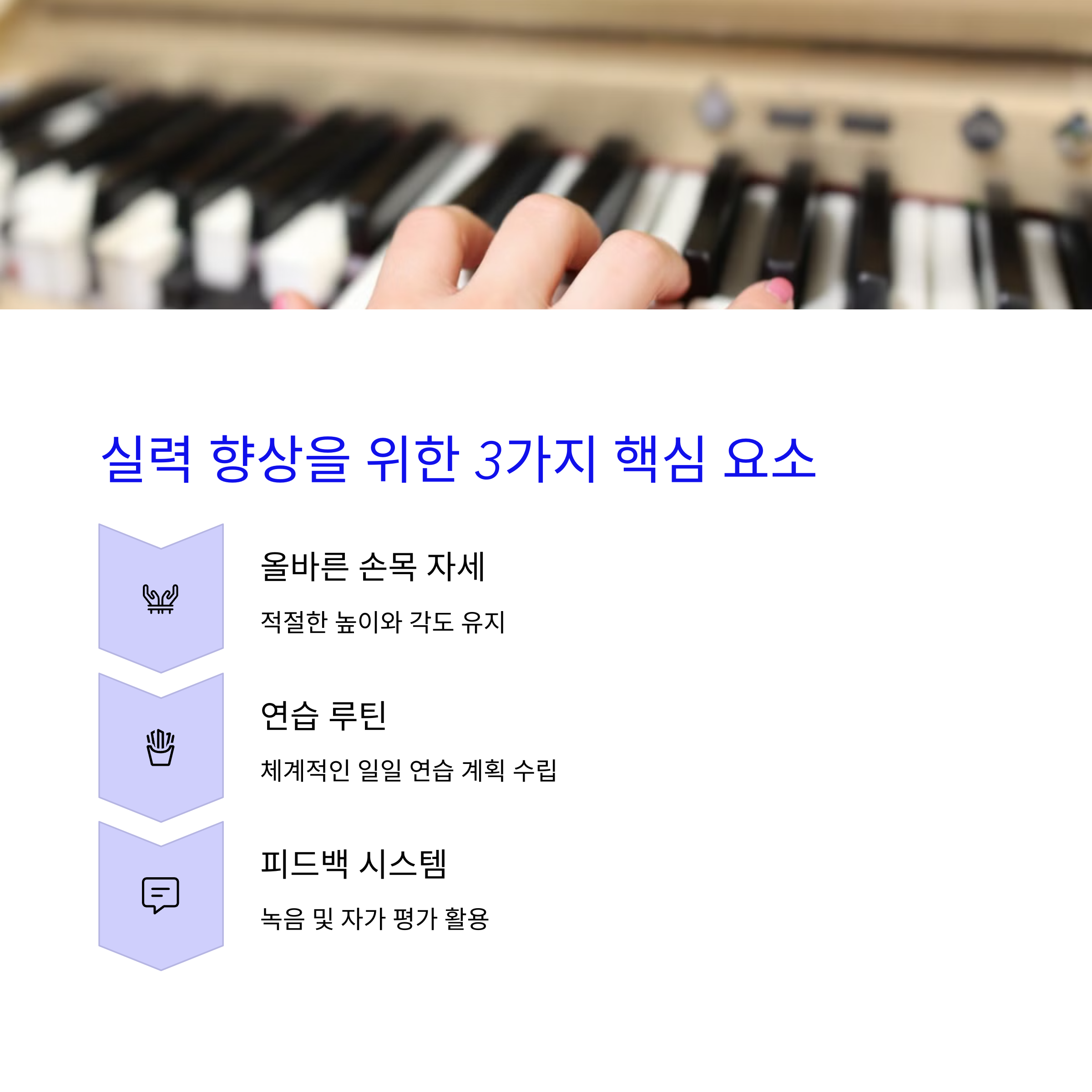 | 손목이 꺾이지 않도록 자연스럽게 유지 | 하루 30분씩 파트 나눠 계획 세우기 | 녹음, 영상, 커뮤니티 등을 통한 자기 점검 |
