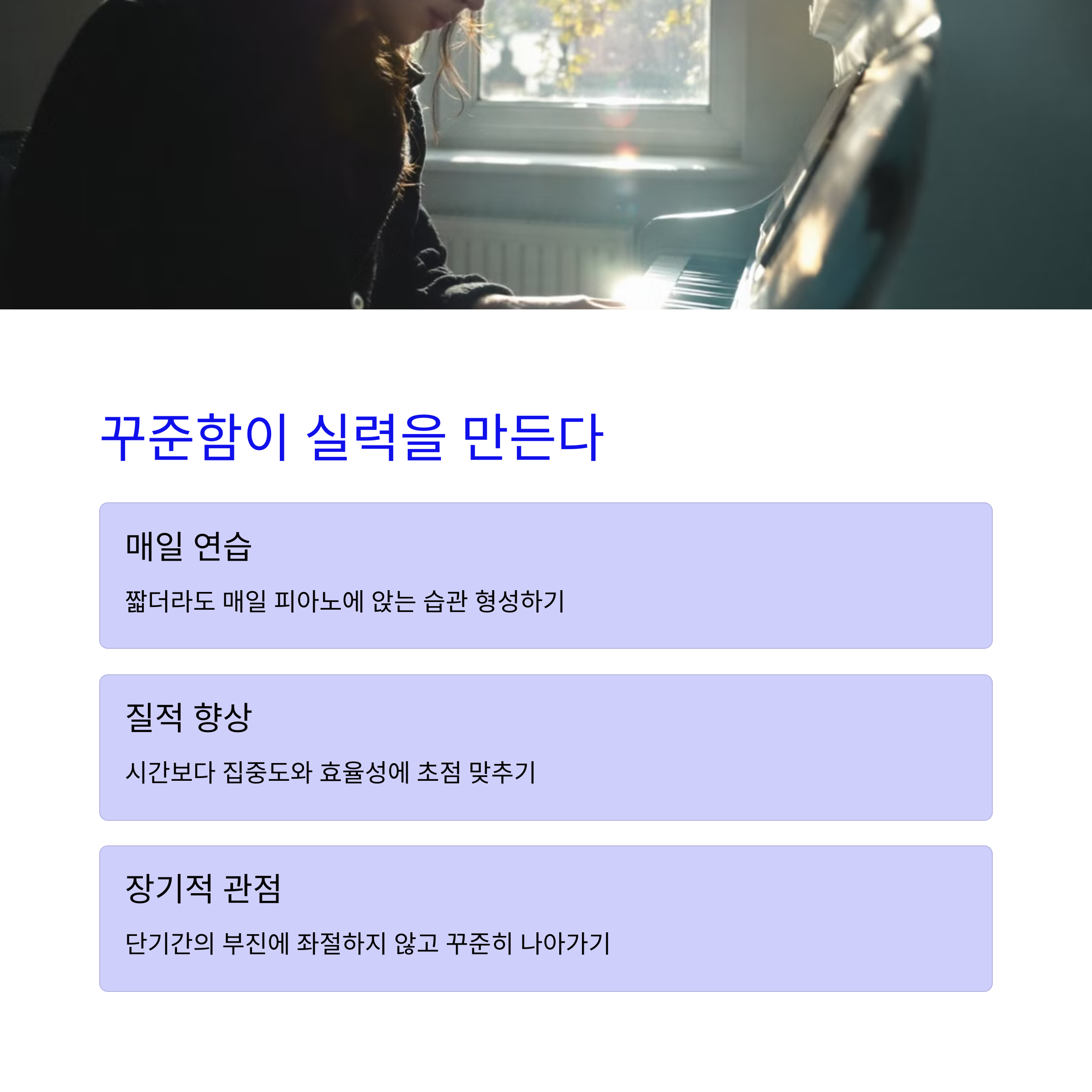 피아노 독학은 분명 쉽지 않은 길일 수 있습니다. 하지만 오늘 소개한 흔한 실수들을 피하고, 올바른 방향으로 연습한다면 누구나 음악의 즐거움을 느낄 수 있습니다. 독학이기에 가능한 유연한 연습 루틴과 자기주도적인 학습은 오히려 더 큰 동기부여가 될 수 있습니다. 가장 중요한 것은 실수에 좌절하지 않고, 꾸준히 나아가는 자세입니다. 오늘 이 글이 피아노를 사랑하는 여러분의 연습에 조금이나마 도움이 되었기를 바랍니다.