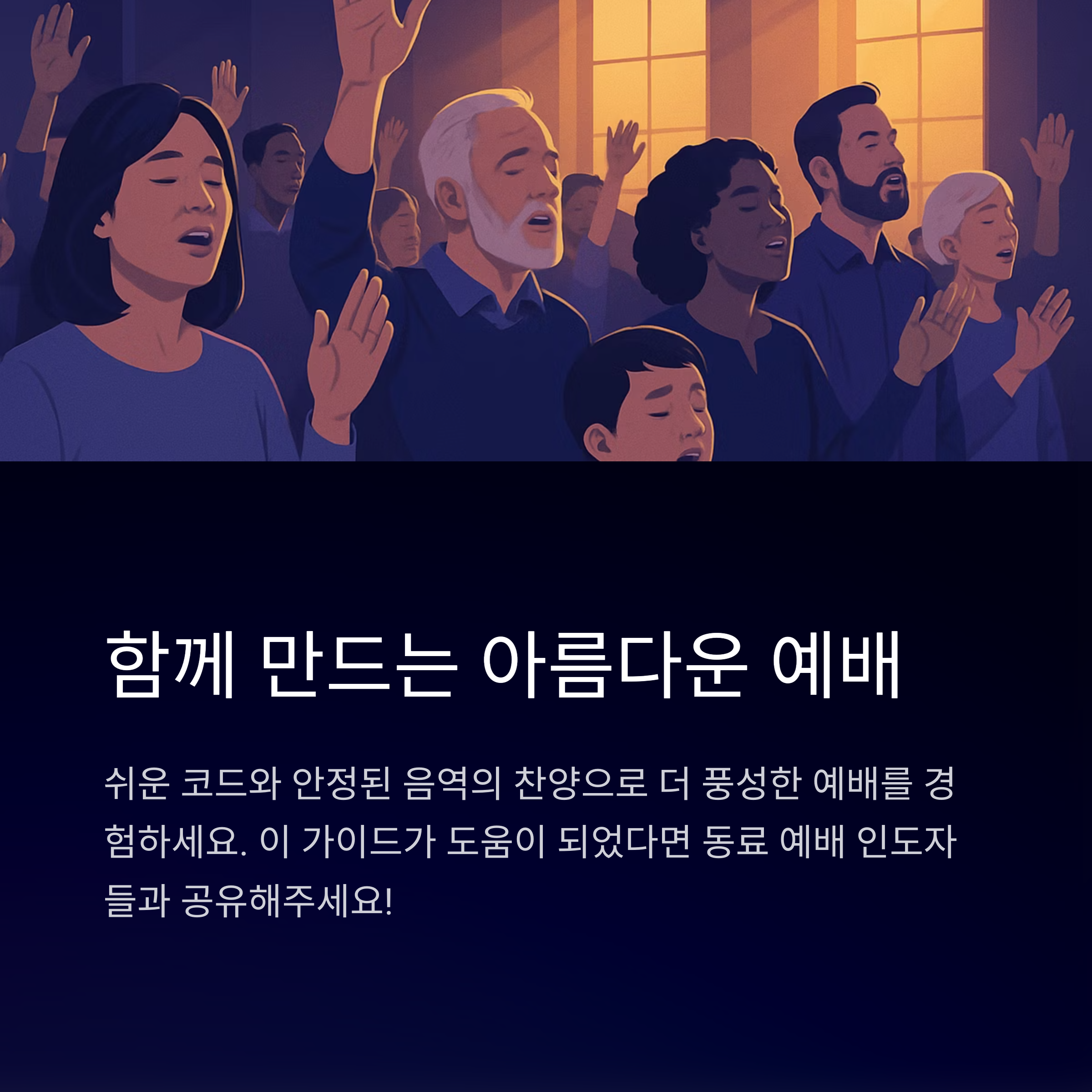 회중 찬양의 핵심은 모두가 함께 부르며 고백할 수 있는 찬양입니다. 이때 중요한 요소 중 하나가 바로 코드입니다. 회중이 쉽게 따라 부를 수 있도록 음역대가 무리 없고 코드 구조가 단순한 곡이 적합합니다. 이번 글에서는 회중 찬양에 적합한 코드 추천을 주제로, 예배 인도자와 찬양팀이 사용할 수 있는 실전 코드 가이드를 정리해봤습니다.