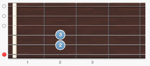 A |---2--- (5번 줄: 중지 손가락으로 2프렛)