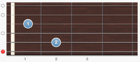 • 중지 손가락: 5번 줄(A)의 2프렛을 누릅니다.