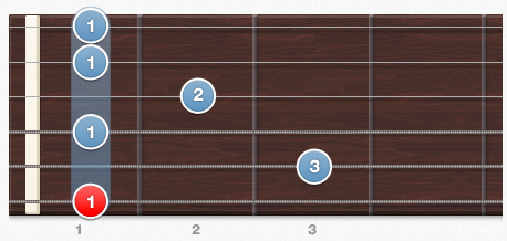 - 검지 손가락으로 바레(barre)에서 1프렛을 누릅니다.