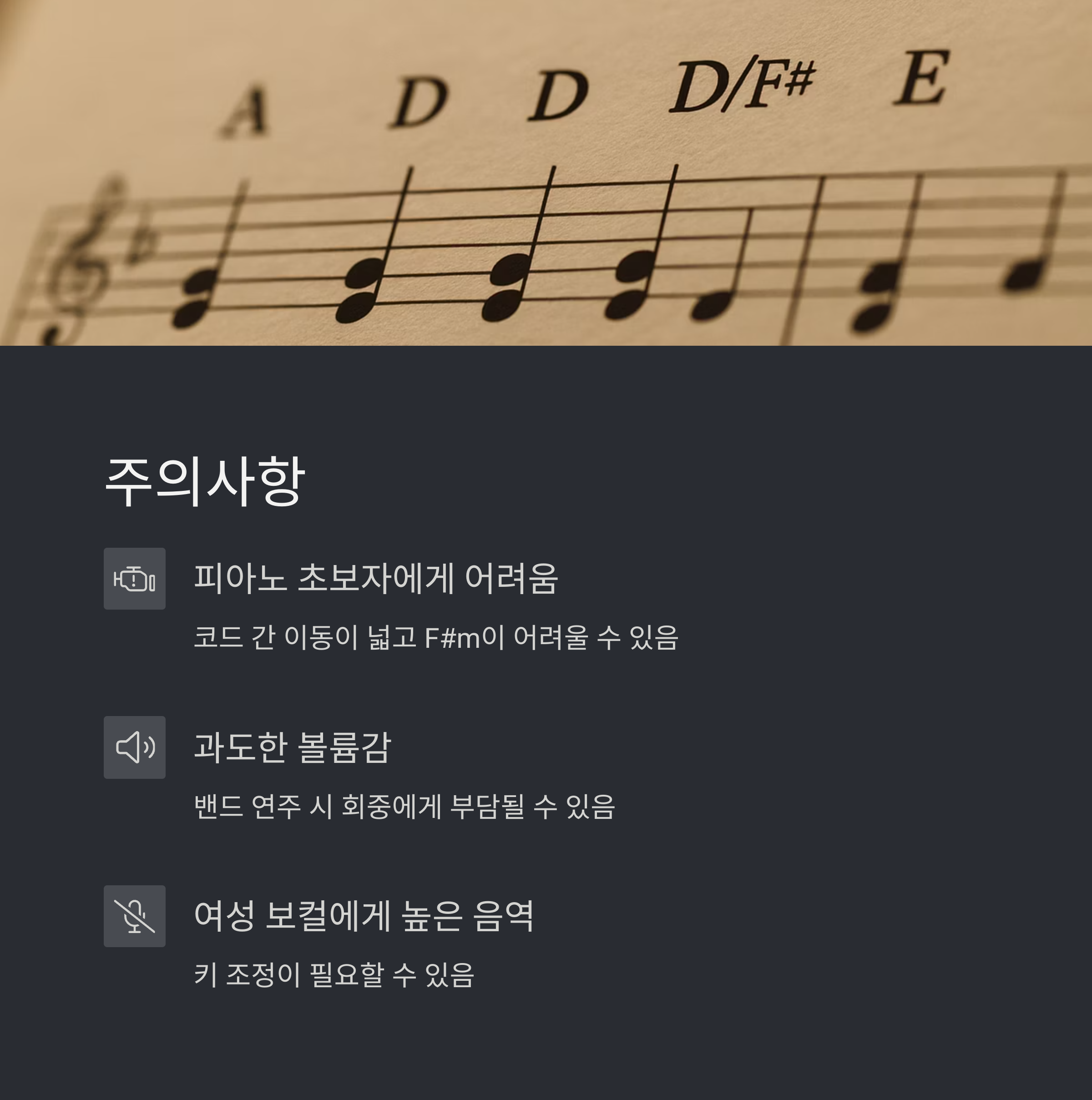 코드 간 이동이 넓고, F#m과 같은 코드가 어렵게 느껴질 수 있습니다. - 과도한 볼륨감 주의