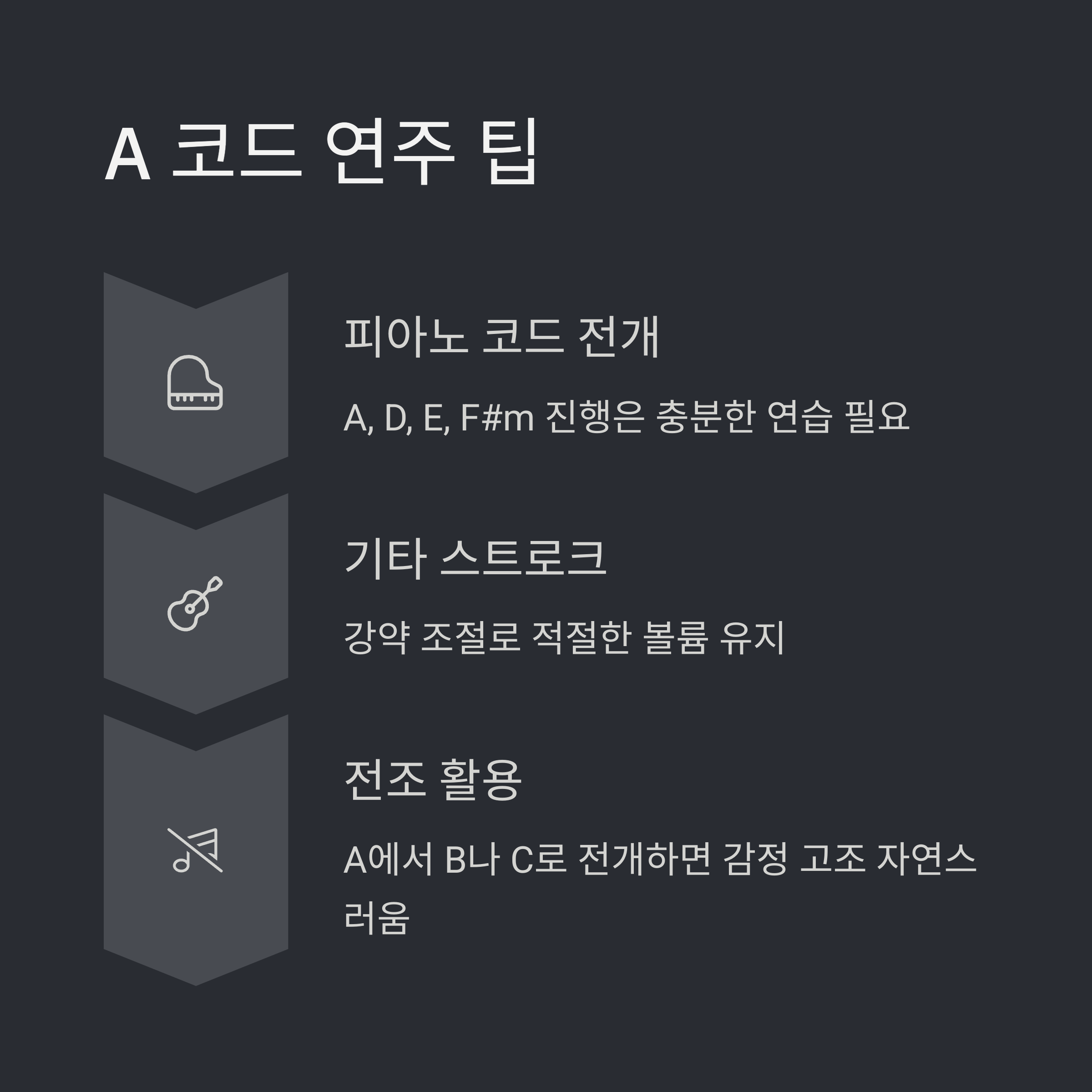 A 코드는 단순하지만 강하게 치면 너무 시끄러워질 수 있으므로 조절이 필요합니다. - 전조 활용 팁