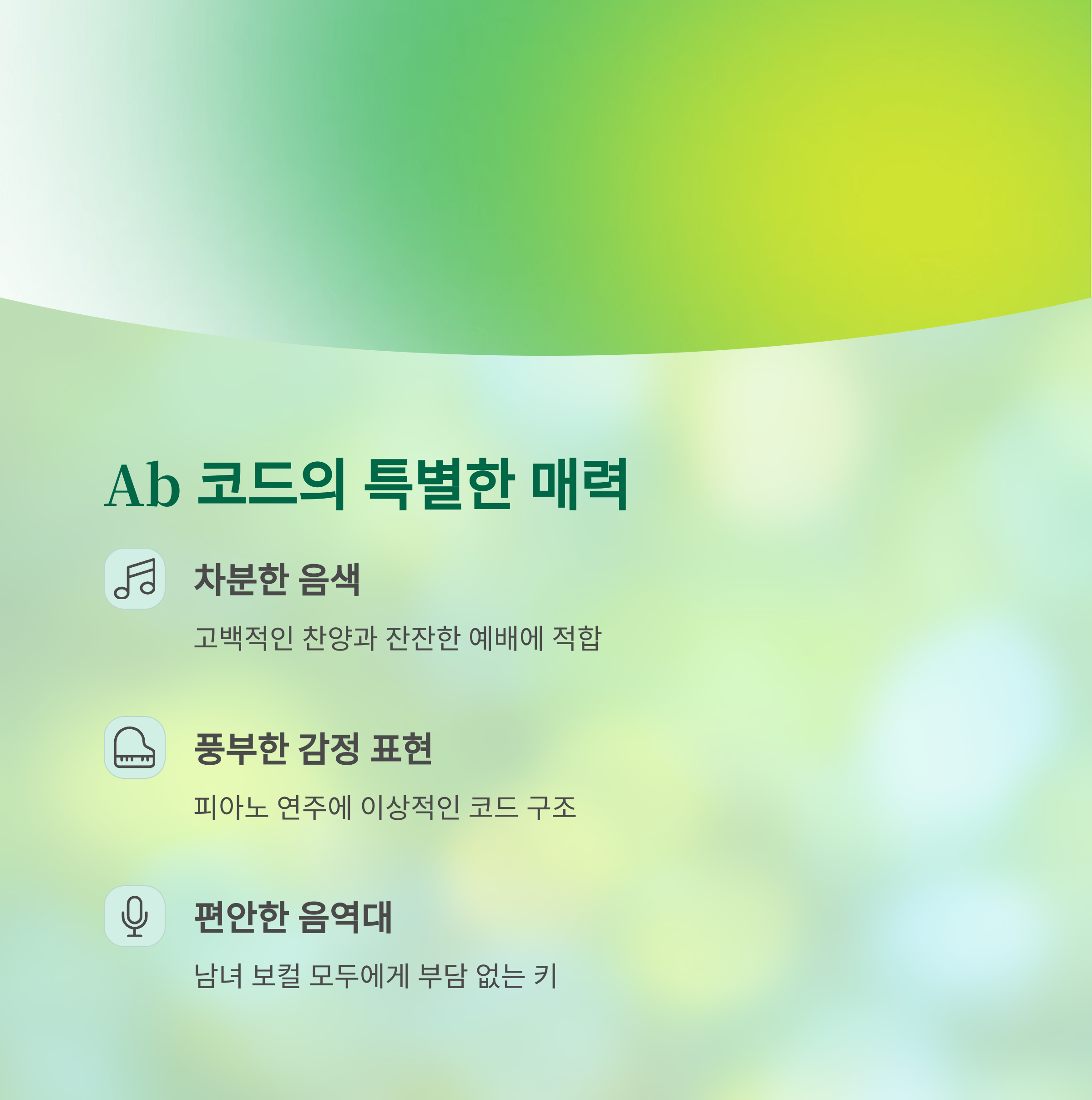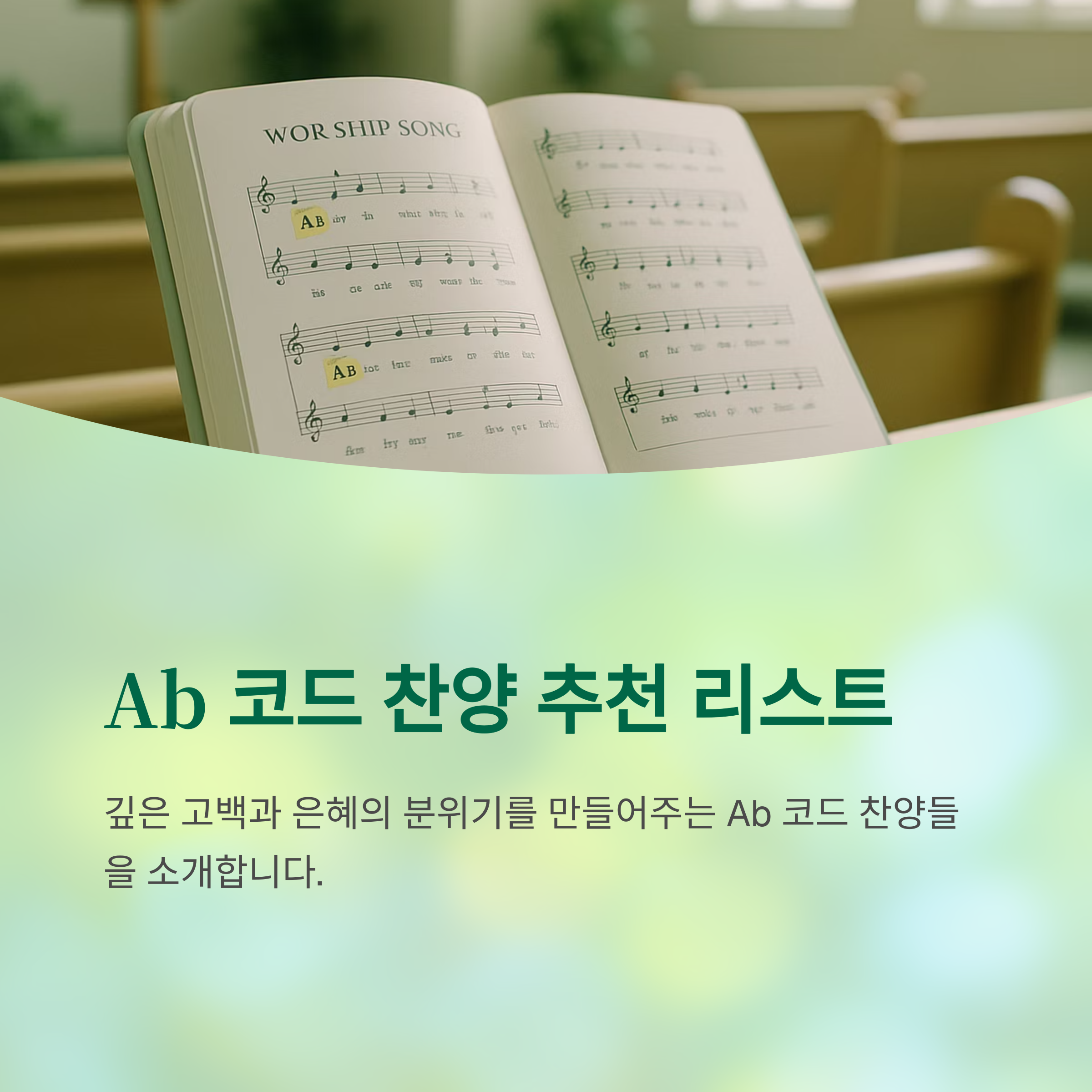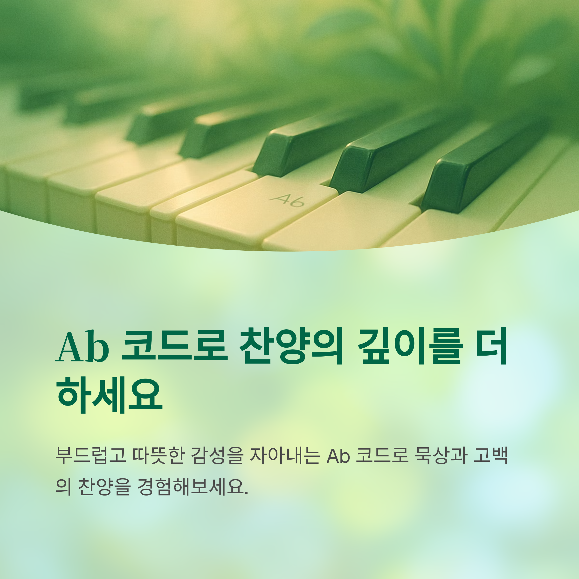 Ab 코드 찬양 추천은 차분하고 고백적인 찬양, 깊은 묵상의 시간이 필요할 때 탁월한 선택입니다. 피아노 연주자에게 특히 추천하며, 예배의 감정선을 풍성하게 만들고 싶을 때 활용해 보세요.