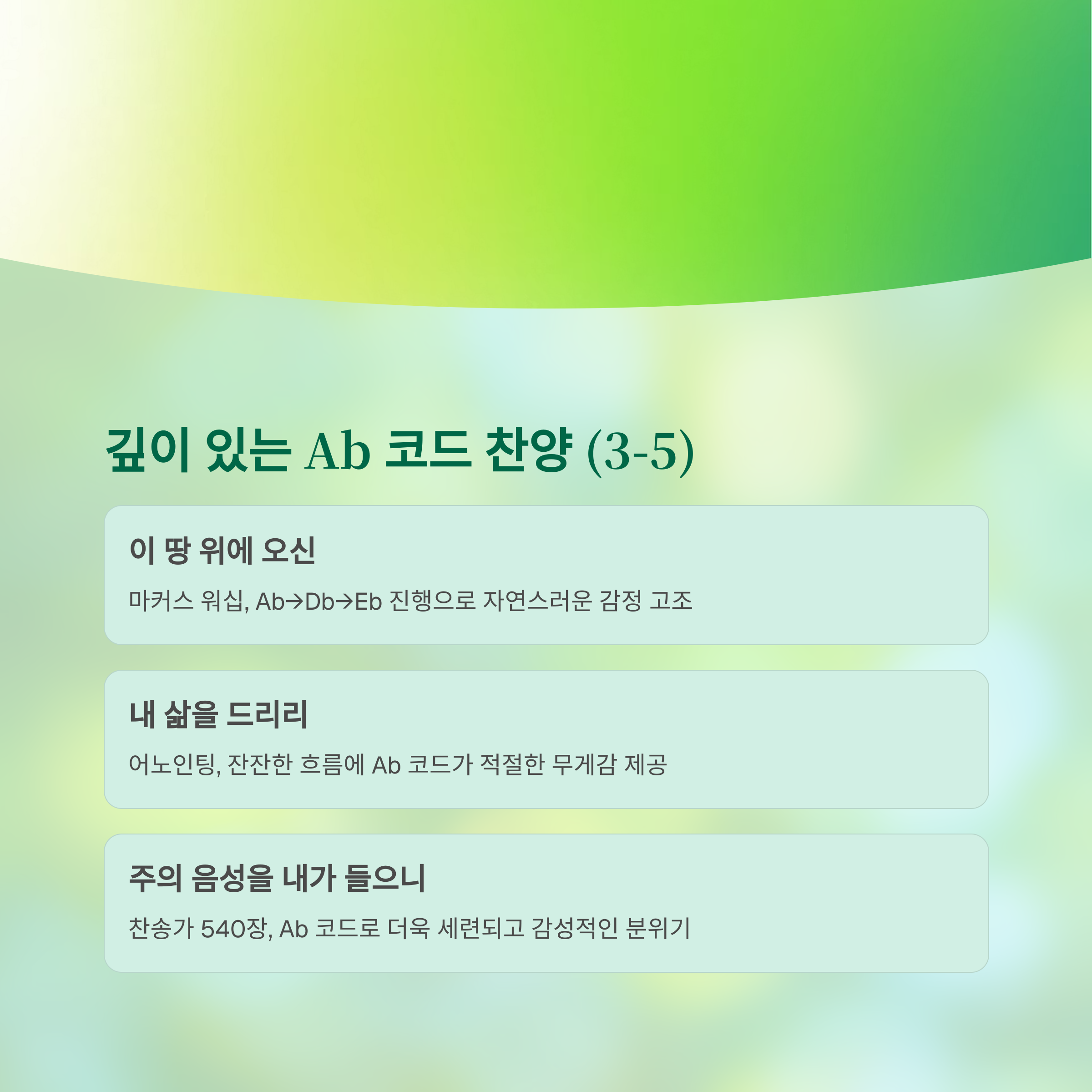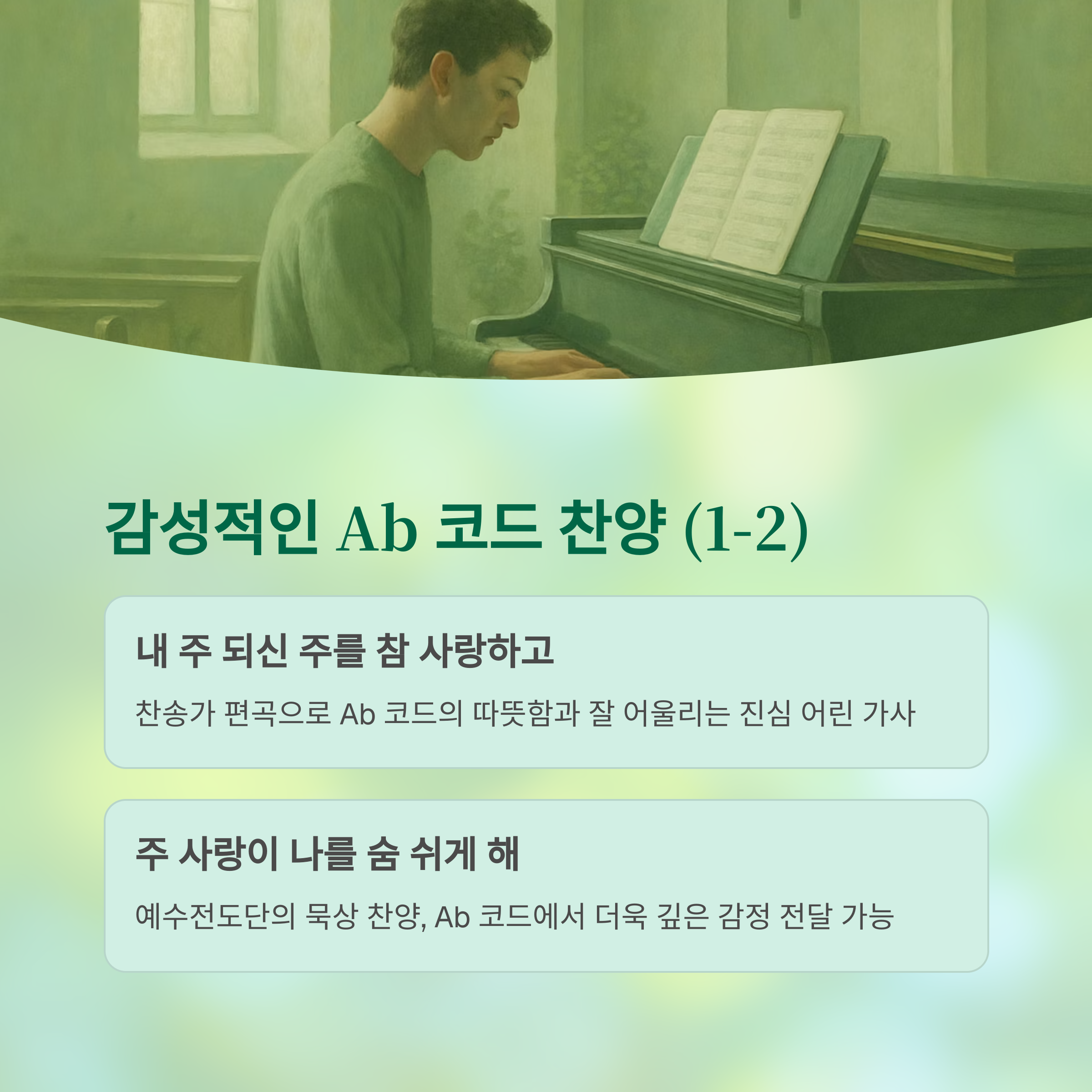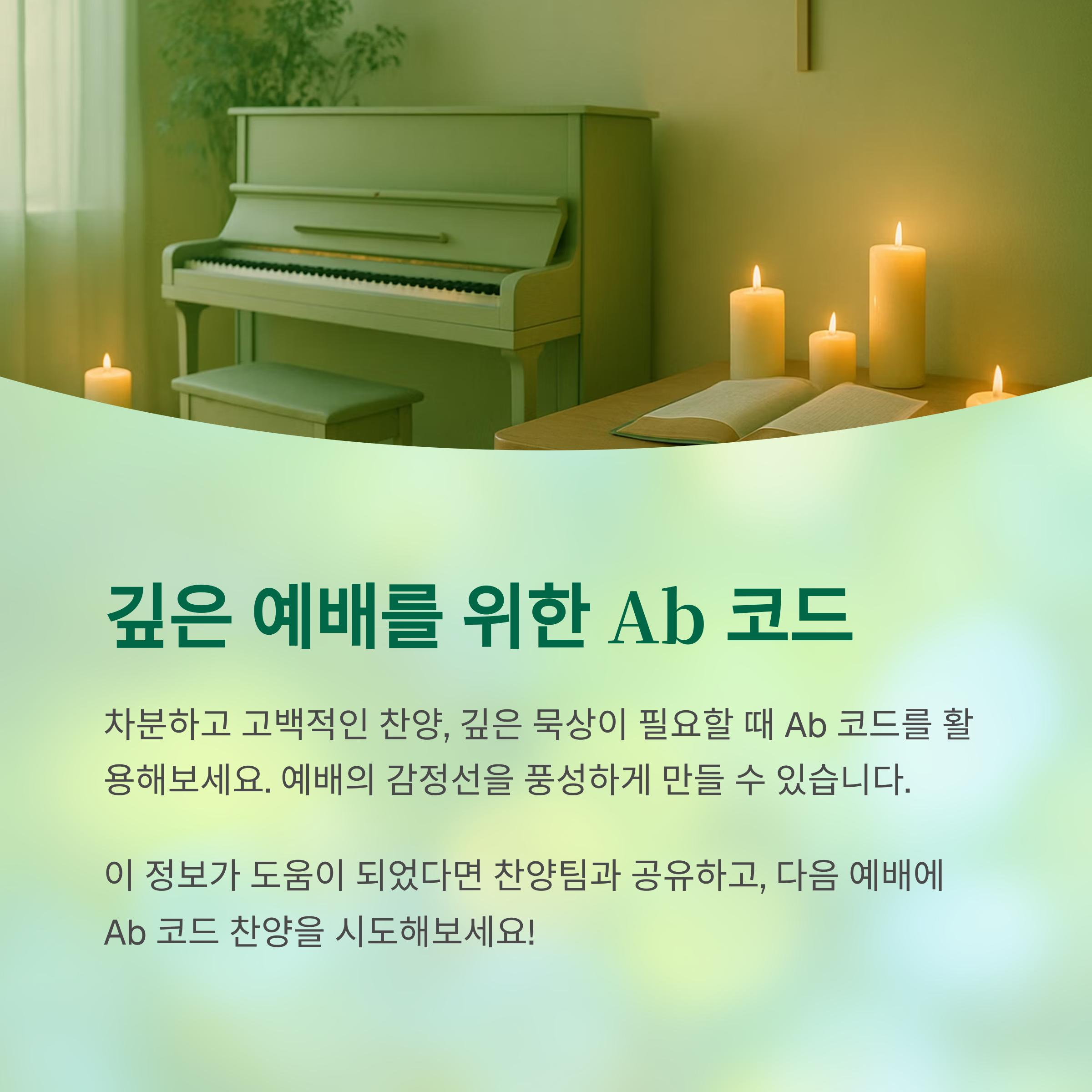 Ab 코드 찬양 추천은 차분하고 고백적인 찬양, 깊은 묵상의 시간이 필요할 때 탁월한 선택입니다. 피아노 연주자에게 특히 추천하며, 예배의 감정선을 풍성하게 만들고 싶을 때 활용해 보세요.