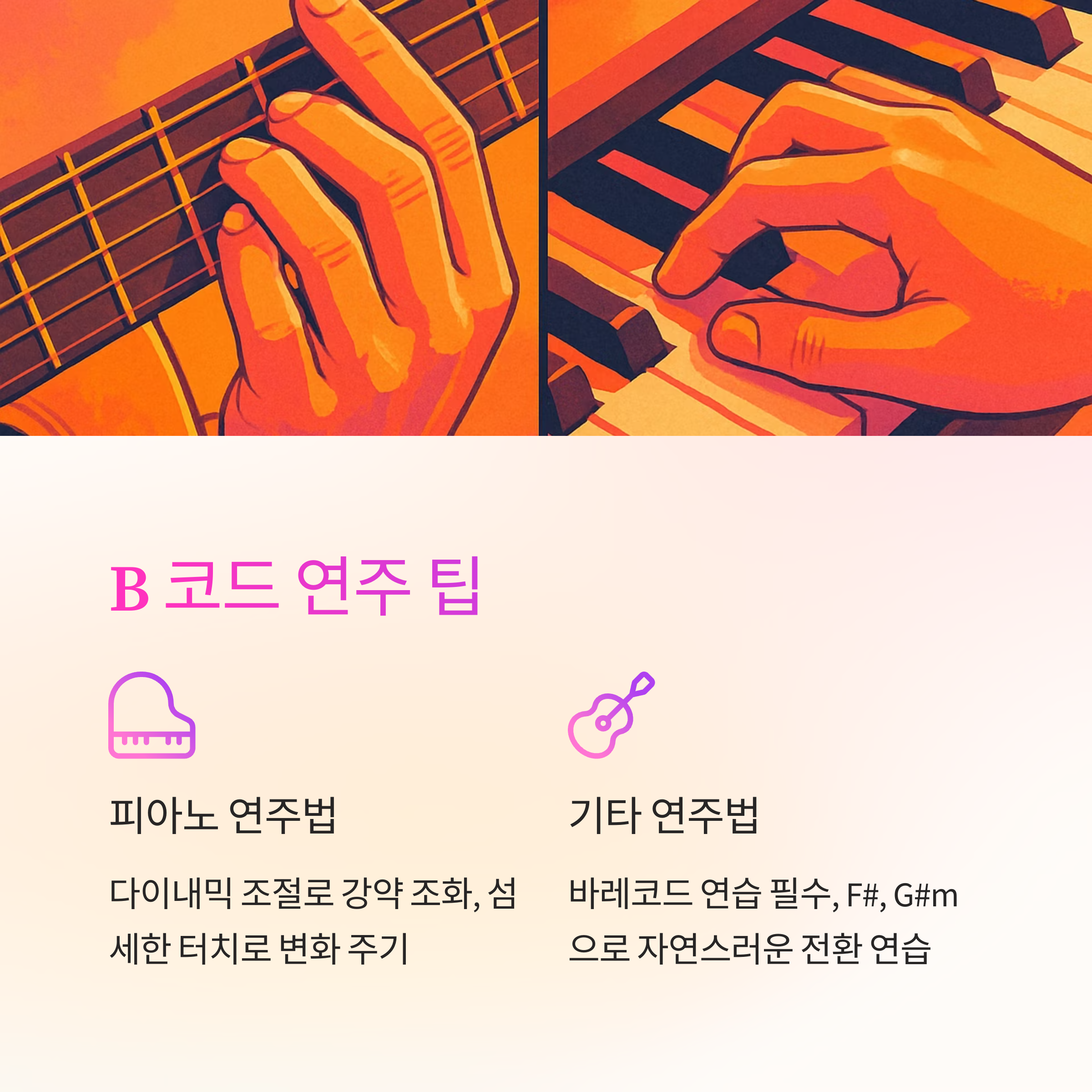 B 코드 연주는 박력도 중요하지만 섬세한 터치로 변화를 줄 수 있어야 합니다. - 기타: 바레코드 연습 필수