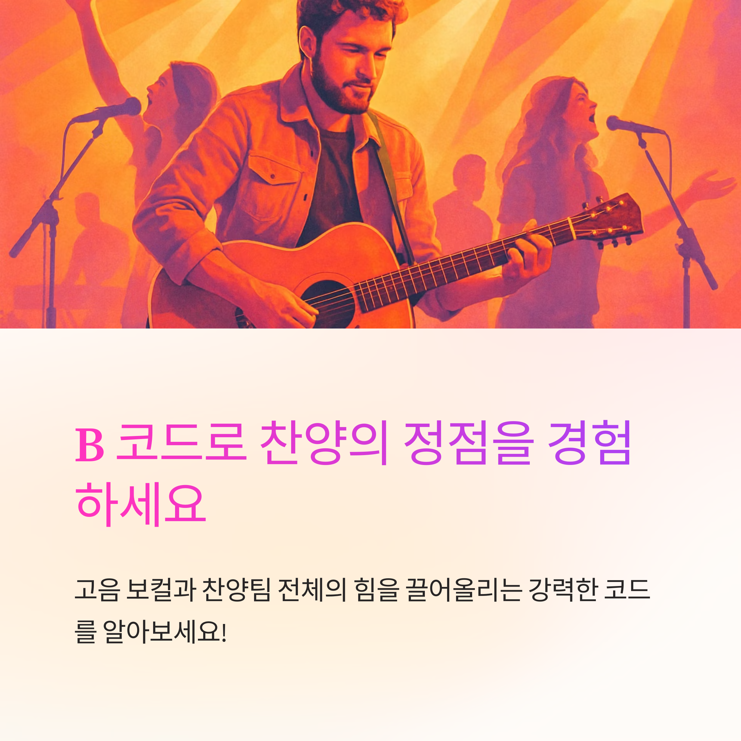 B 코드 찬양 추천은 고조감 있는 예배, 찬양팀의 역량을 끌어올리는 데 최적의 코드입니다. 고음 보컬이나 특별한 순서에서 쓰일 때 더 큰 은혜를 경험할 수 있습니다. 지금 소개한 곡들을 연습해 보며 B 코드의 묵직한 감동을 느껴보세요.