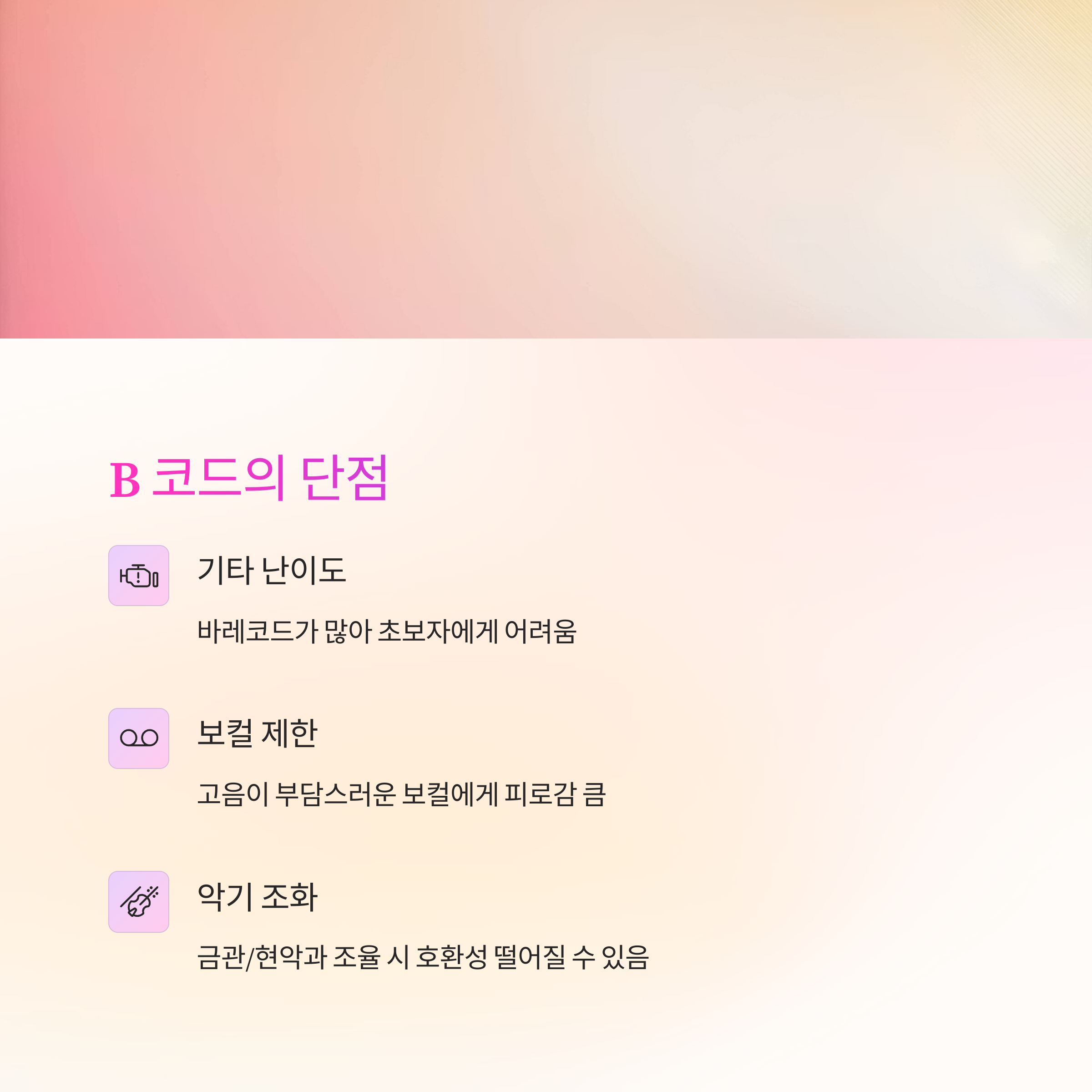 바레코드가 많아 초보자에겐 연주가 어렵습니다. - 보컬 음역 제한