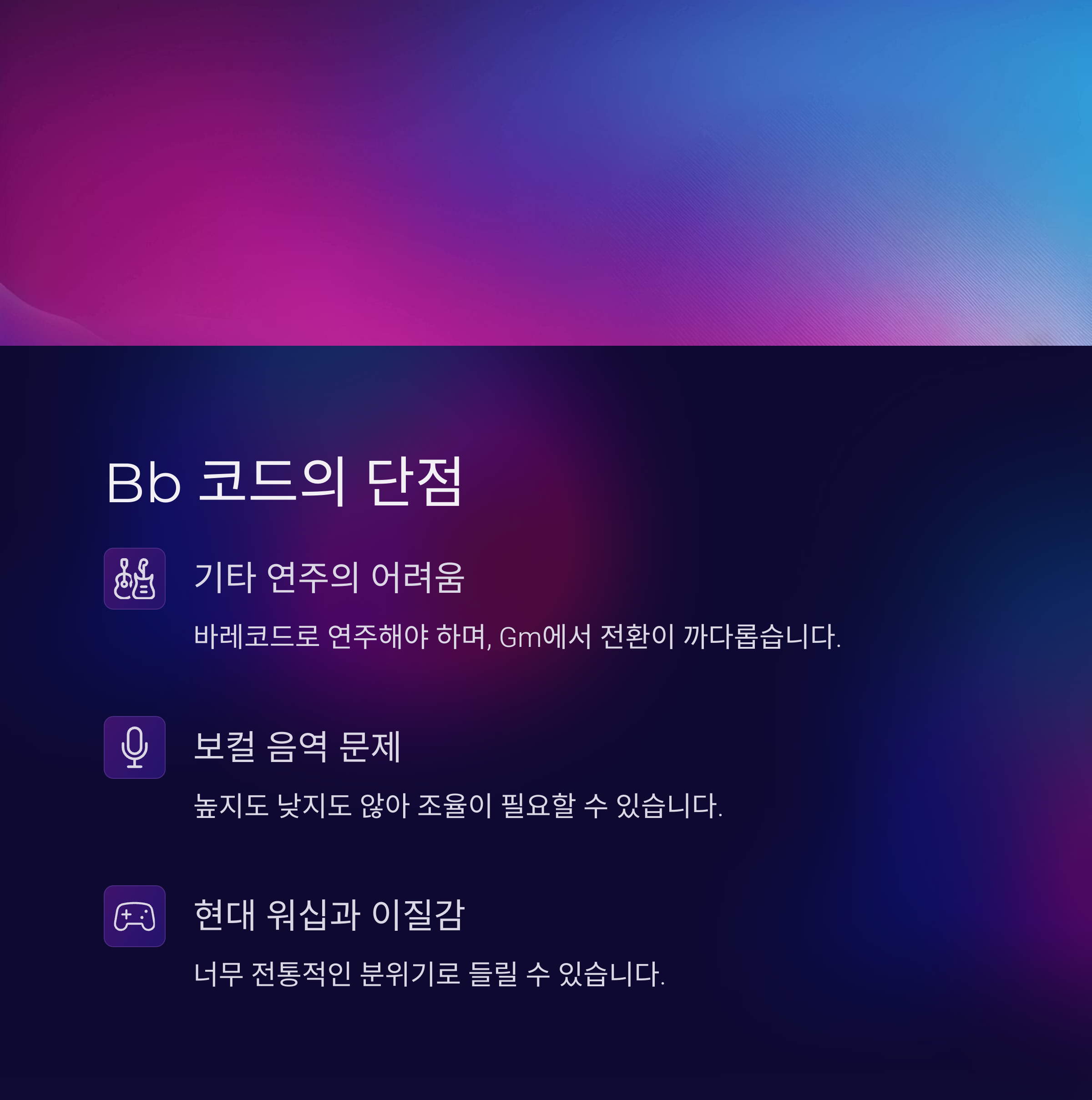 Bb 오픈 코드가 없어 바레코드로 연주해야 하며, 특히 Gm에서 전환이 까다롭습니다. - 일부 보컬에겐 음역이 애매