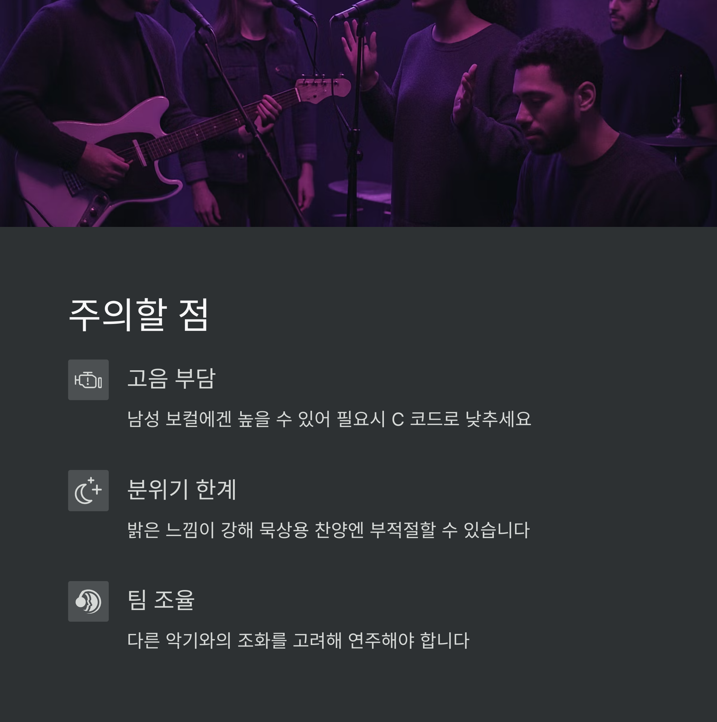 너무 밝은 느낌만 강조되면 묵상용 찬양에는 다소 부적절할 수 있습니다. - 팀 연주 시 조율 필요