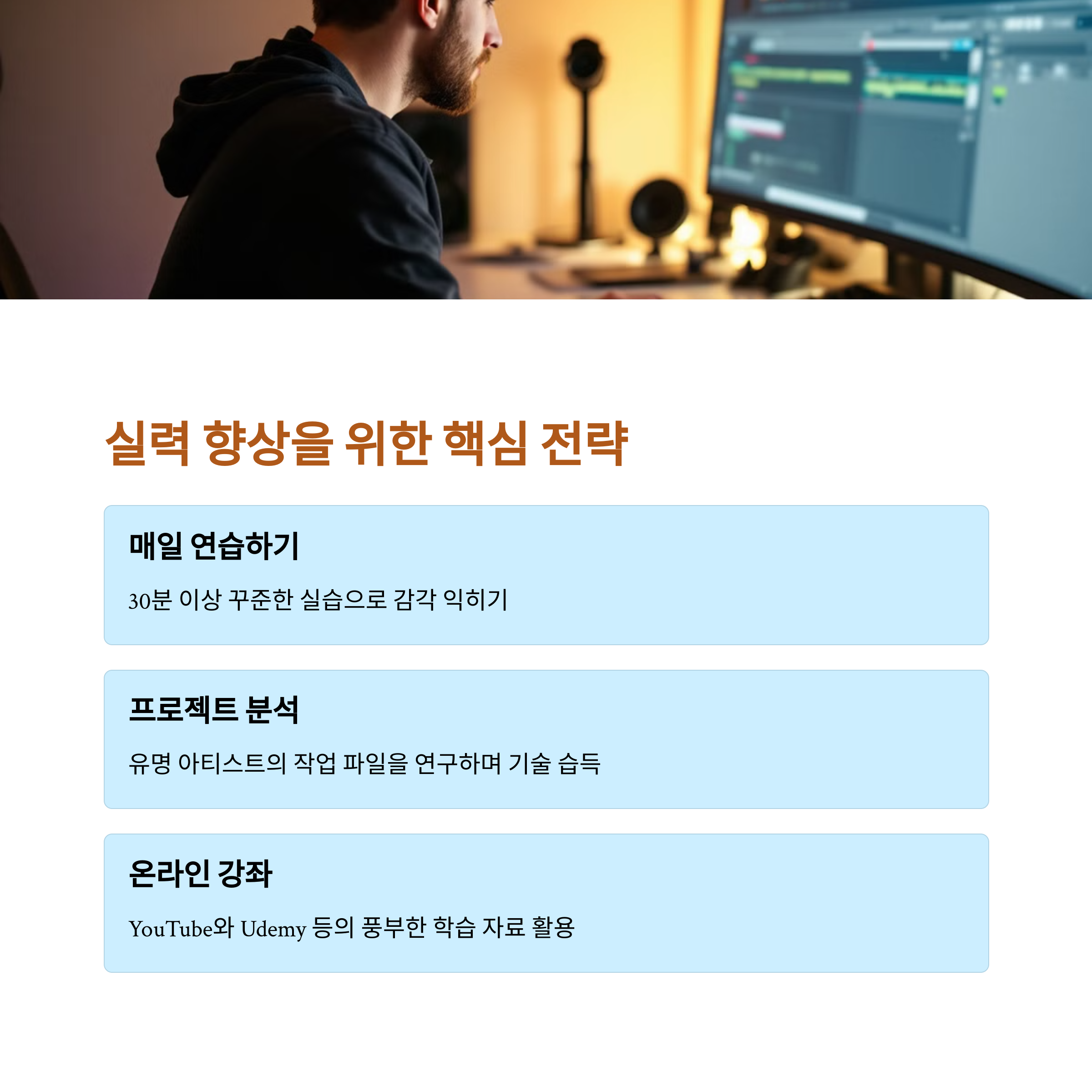 꾸준한 실습과 다양한 사운드 실험이 중요합니다. 튜토리얼과 프로젝트 파일 분석을 통해 기초를 탄탄히 다지는 것이 효과적입니다.