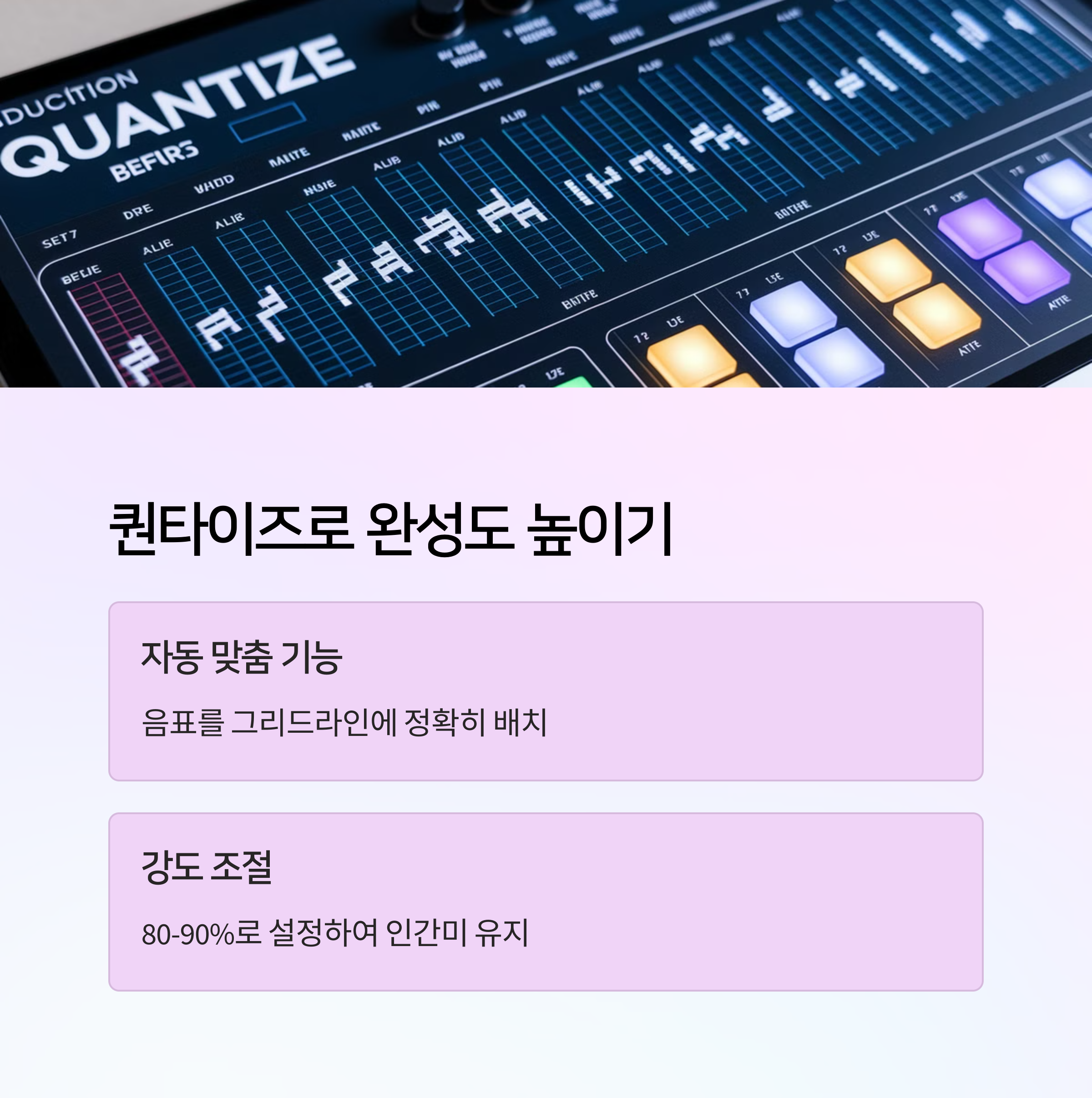 | Novation, Arturia 등 입문자용 인기 | Logic Pro, Ableton Live, FL Studio 등 지원 | 클랩, 킥, 하이햇 리듬을 나눠서 연습하기 |