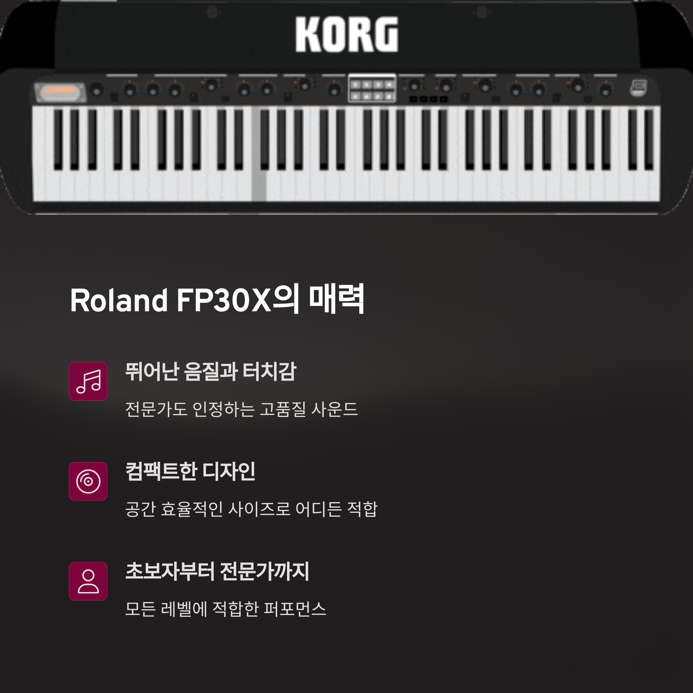 | Roland FP30X 중고는 60~90만 원대가 일반적입니다. | 외관, 건반, 페달, 음향 이상 여부를 반드시 확인하세요. | 연습, 공연, 홈레코딩 등 다양한 목적에 활용 가능. |